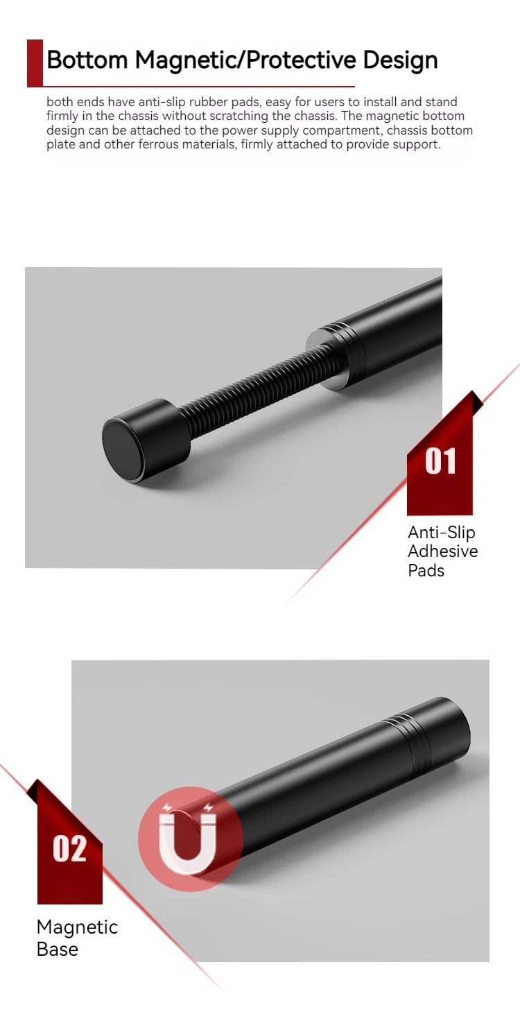 ป้องกันความปลอดภัย การดูดแม่เหล็กกันลื่นและมั่นคงมีแผ่นยางกันลื่นที่ปลายทั้งสองข้าง ซึ่งสะดวกสําหรับผู้ใช้ในการติดตั้งและยืนอย่างมั่นคงในแชสซีเพื่อหลีกเลี่ยงการกระแทกกราฟิกการ์ดด้านล่างได้รับการออกแบบด้วยการดูดด้วยแม่เหล็ก ซึ่งสามารถดูดซับบนวัสดุที่เป็นเหล็ก เช่น ช่องจ่ายไฟและแผ่นด้านล่างของแชสซี และสามารถดูดซับได้อย่างแน่นหนาและให้การสนับสนุน