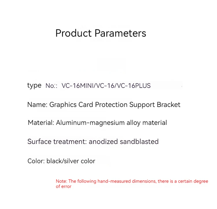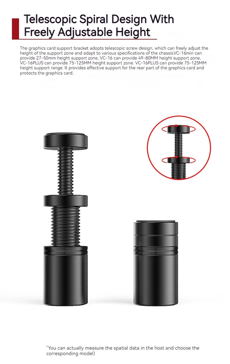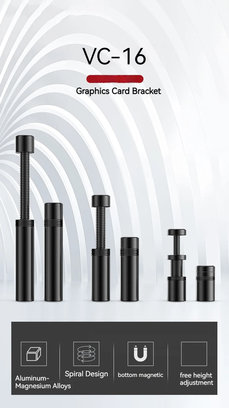 การออกแบบเกลียวแบบยืดไสลด์ตัวยึดกราฟิกการ์ดใช้การออกแบบสกรูแบบยืดไสลด์สามารถปรับความสูงได้อย่างอิสระ โดยปรับให้เข้ากับข้อกําหนดต่างๆ ของแชสซีให้การสนับสนุนที่มีประสิทธิภาพสําหรับด้านหลังของกราฟิกการ์ดและคุ้มกันกราฟิกการ์ด