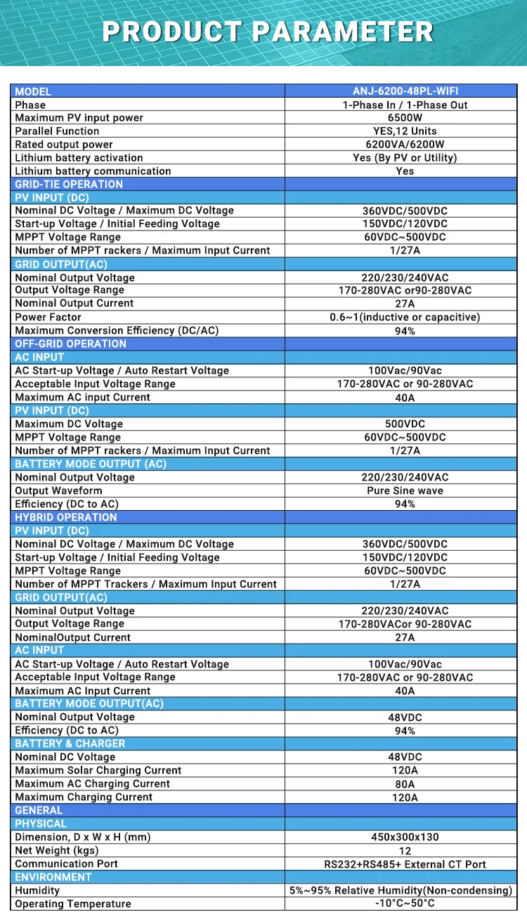* ตัวควบคุม MPPT ในตัว: 120A ประสิทธิภาพสูง