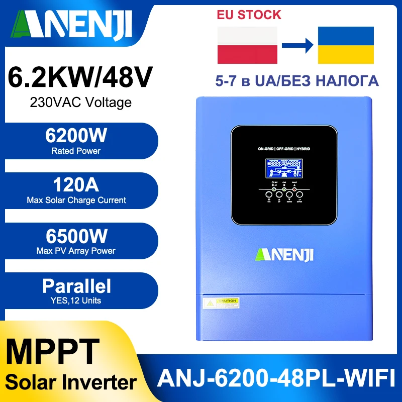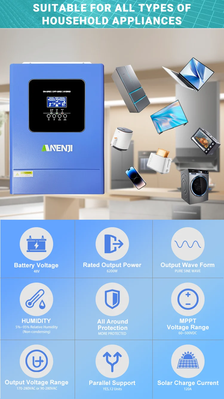อินเวอร์เตอร์ไฮบริดพลังงานแสงอาทิตย์ ANENJI 6.2KW 11KW 4KW 220V 48V แบบ On/Off Grid พร้อม Wifi MPPT คลื่นไซน์บริสุทธิ์ พร้อมเซ็นเซอร์ CT สำหรับแผงโซลาร์เซลล์