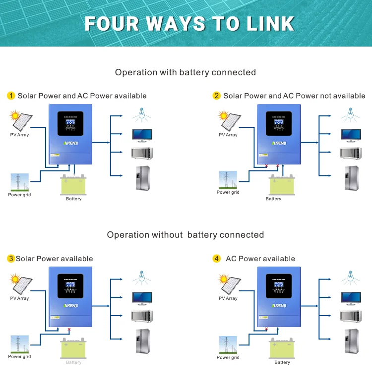 * Grid-tie, Off-grid และ Grid-tie พร้อมระบบสำรองสำหรับการจัดการพลังงานที่ยืดหยุ่น