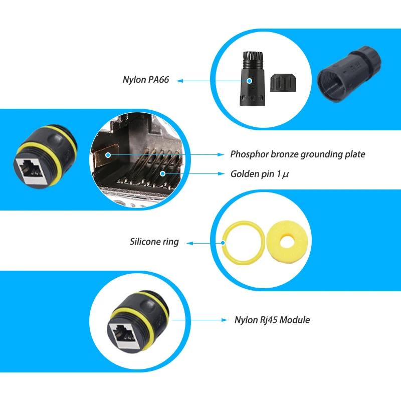 ข้อต่อ RJ45 มาพร้อมกับวัสดุคุณภาพสูงและงานฝีมืออันประณีต ทนทานต่อแรงกดและแรงกระแทก ทนต่ออุณหภูมิสูงและต่ํา ทนทาน และใช้งานได้นาน