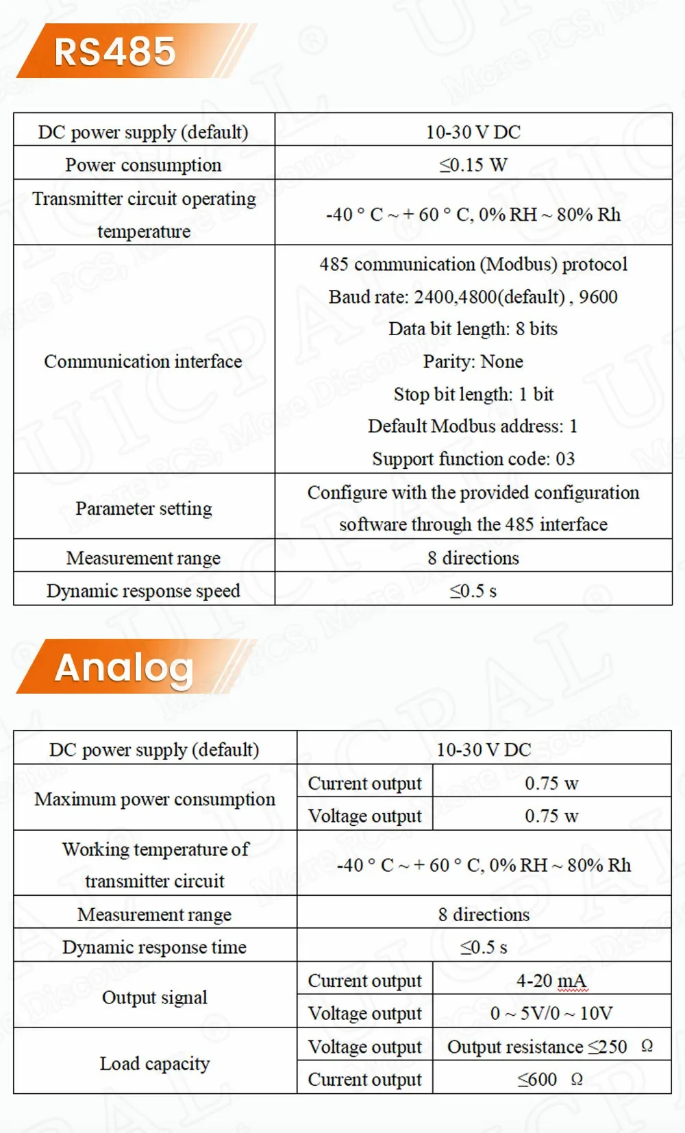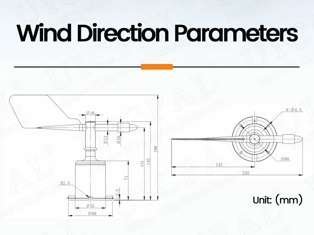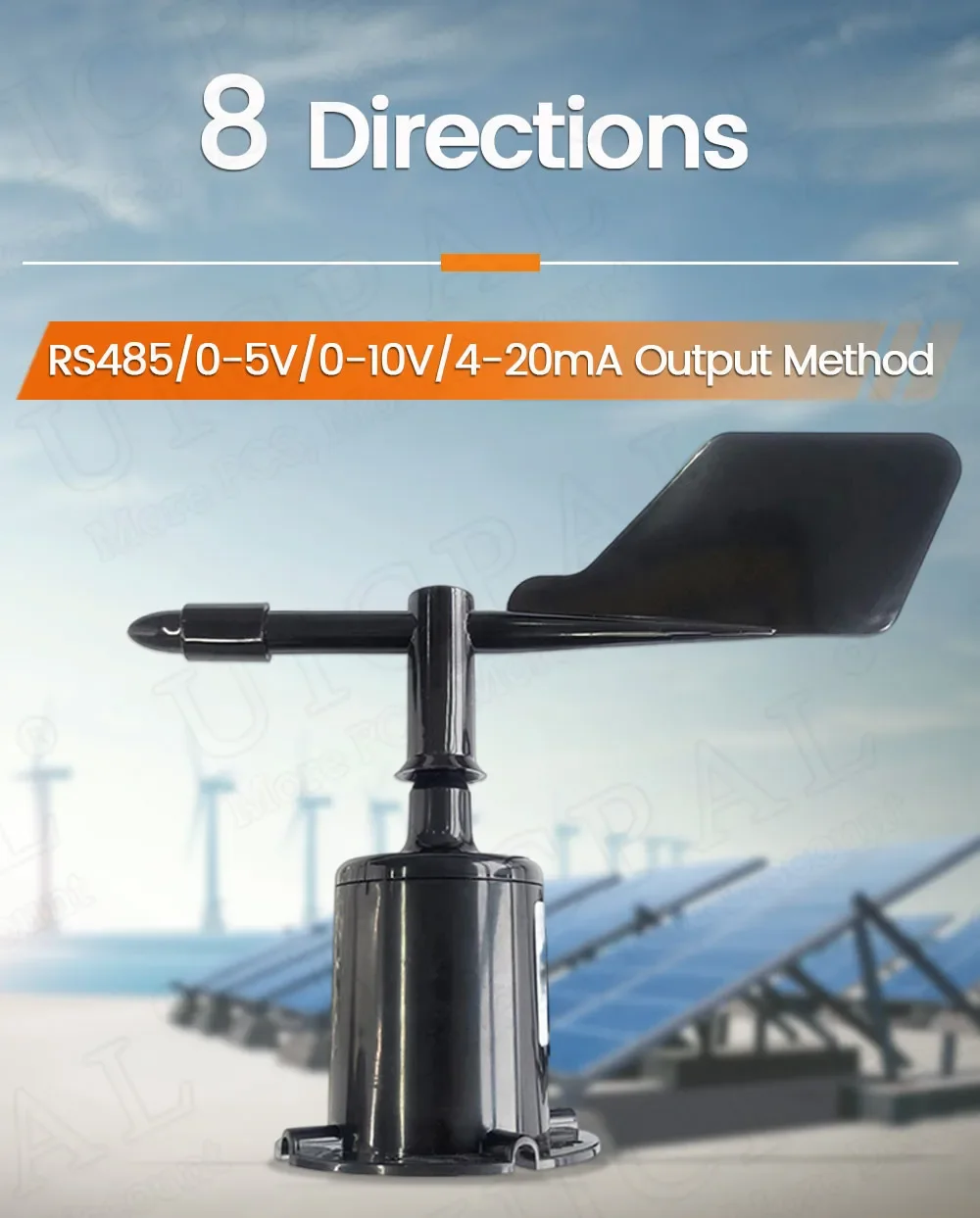 กะทัดรัดและพกพาง่ายต่อการพกพาและประกอบแนวคิดการออกแบบใหม่สามารถรับข้อมูลทิศทางลมได้อย่างมีประสิทธิภาพเปลือกทำจากวัสดุโพลีคาร์บอเนตคอมโพสิตป้องกันการกัดกร่อนได้ดีป้องกันการกัดกร่อนและคุณสมบัติอื่นๆป้องกันการสัมผัสแรงกระแทกสูงและมีระบบแบริ่งเรียบภายในเพื่อรับประกันความถูกต้องของการรวบรวมข้อมูล สัญญาณอะนาล็อกแบบดั้งเดิม (4 -20 mA, 0 -10 V, 0 -5 V) ใช้สำหรับเอาต์พุตข้อมูล มันถูกใช้กันอย่างแพร่หลายในเรือนกระจก, การคุ้มครองสิ่งแวดล้อม, สถานีสภาพอากาศ, เรือ, ท่าเรือ, การเพาะเลี้ยงสัตว์น้ำและการวัดทิศทางลมสิ่งแวดล้อมอื่นๆ