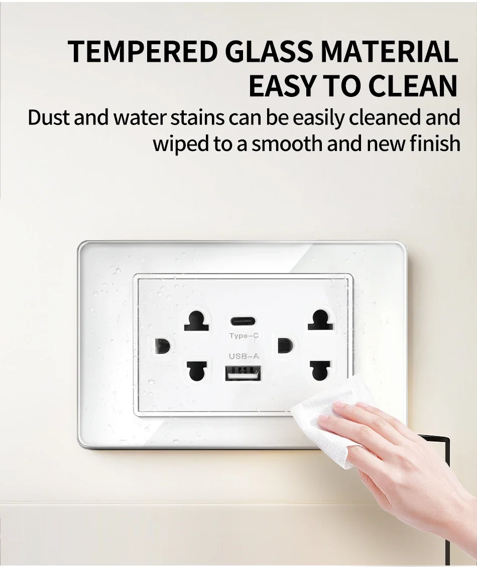 T&I US Standard 118 เต้ารับติดผนังพร้อมสวิตช์ แผงกระจกนิรภัย พอร์ตชาร์จ USB และ Type-C
