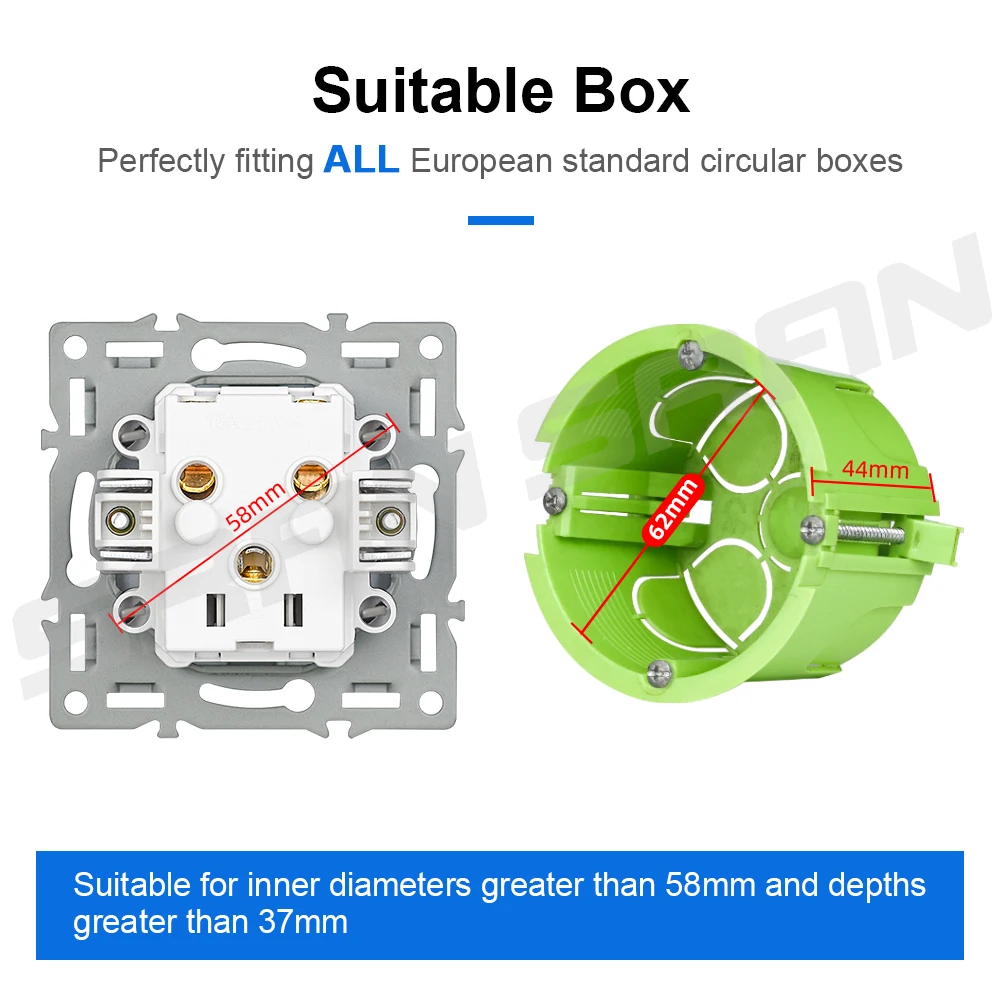 ซ็อกเก็ตแบบเรียบง่ายที่มีกรงเล็บเหล็กติดตั้งอยู่ด้านหลังเหมาะสำหรับกล่องมาตรฐานยุโรป