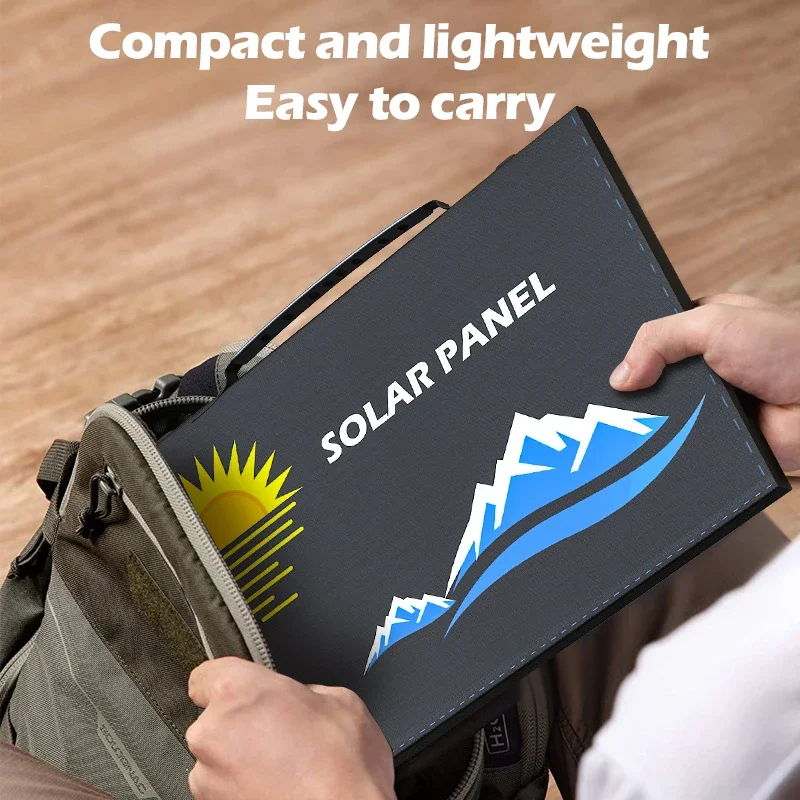 * พับได้และพกพาได้: แผงโซลาร์เซลล์ 4 ชิ้นในตัว อุปกรณ์ชาร์จสามารถพับเป็นแท็บเล็ตที่มีขนาดเล็กเท่ากับแท็บเล็ตได้ และได้รับการออกแบบให้มีรูแขวนซึ่งสามารถแขวนไว้ในกระเป๋าเป้สะพายหลังได้อย่างง่ายดายด้วยคลิปปีนเขาที่ให้มา