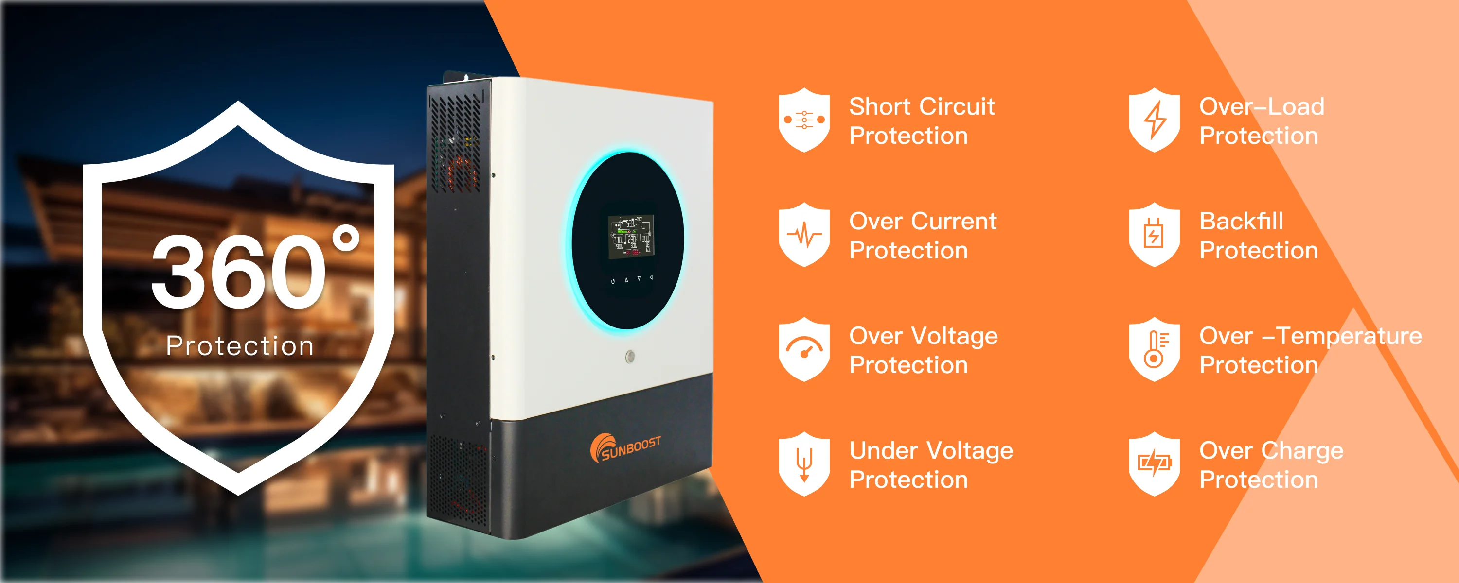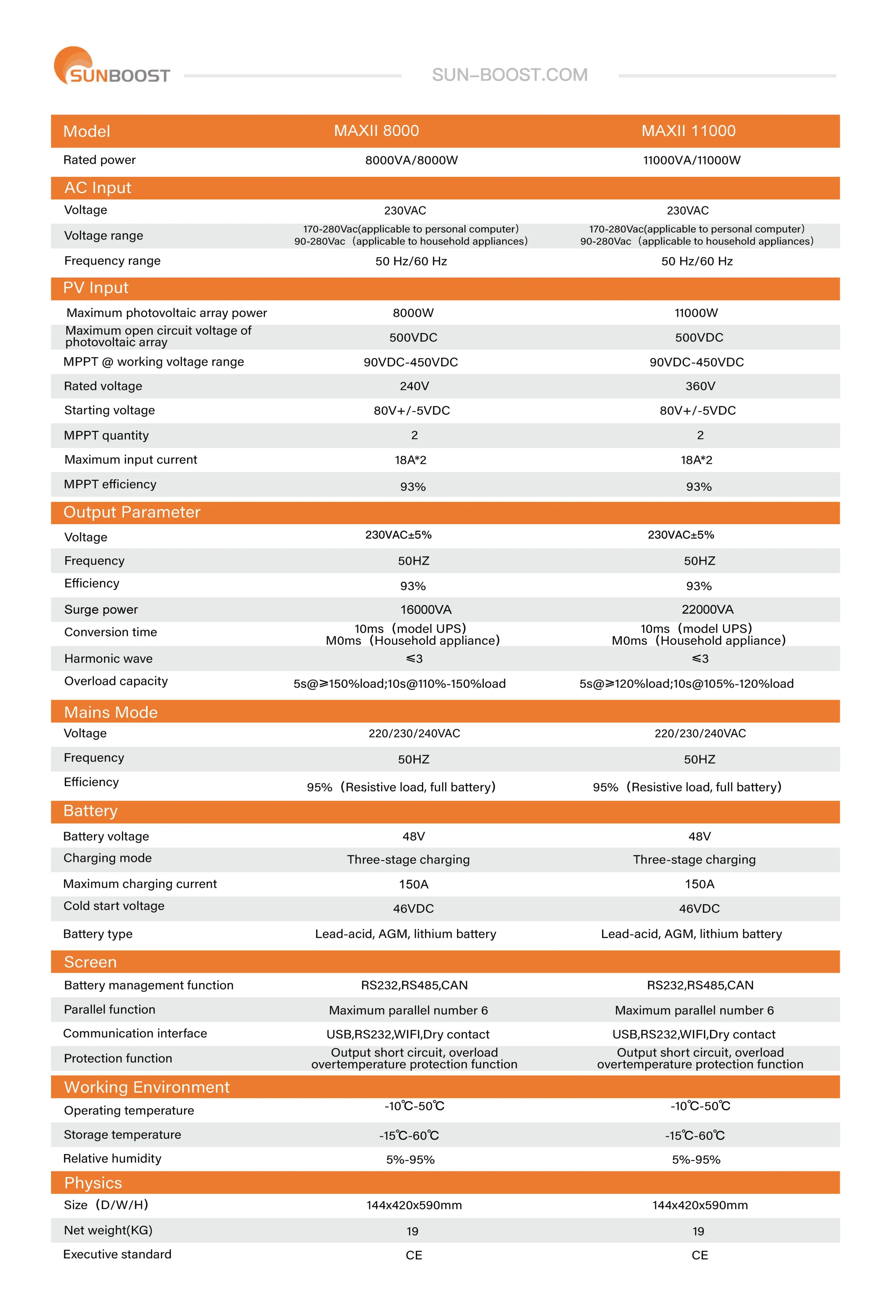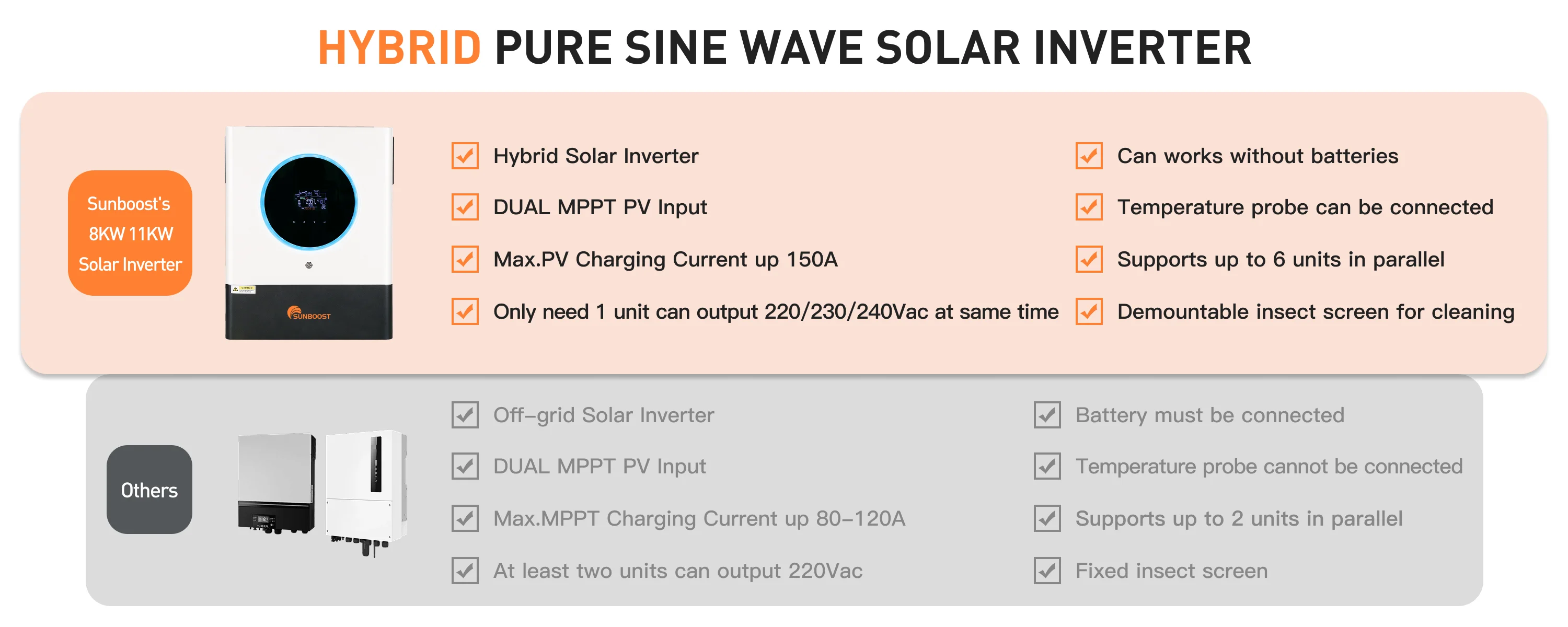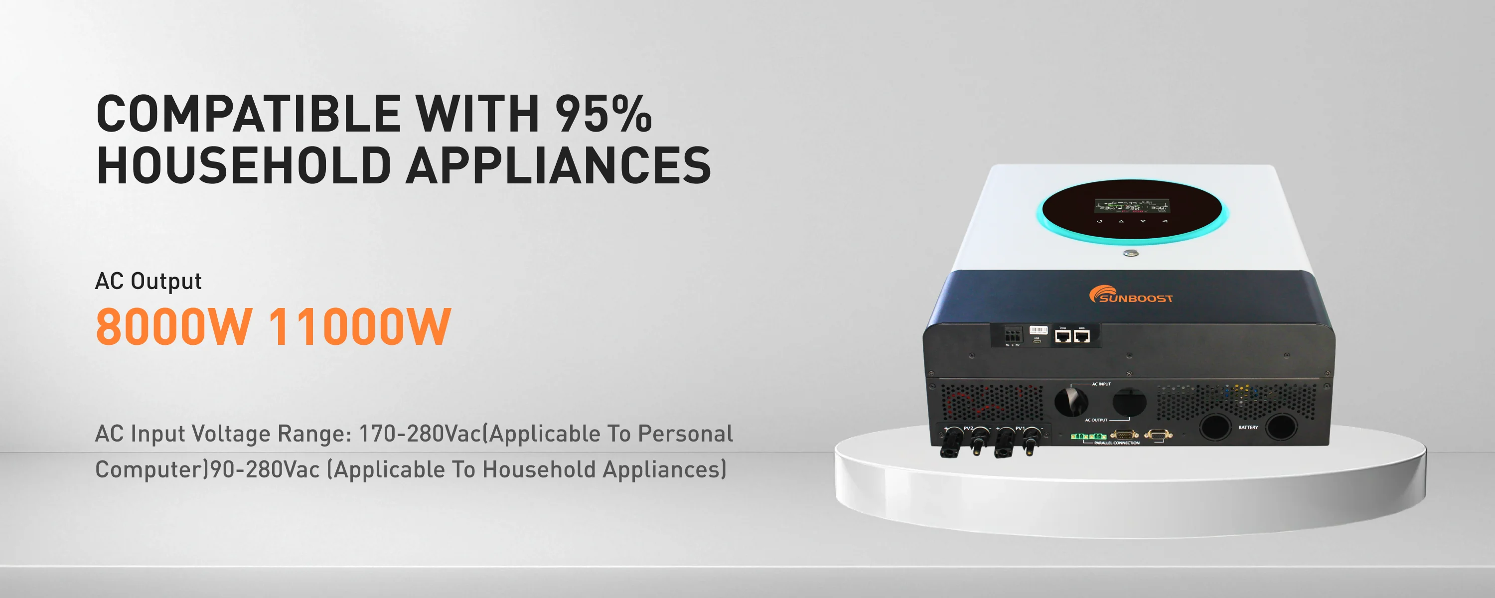 อินเวอร์เตอร์พลังงานแสงอาทิตย์แบบไฮบริด Sunboost 8KW 11KW รองรับการเชื่อมต่อแบบขนาน 6 เครื่อง พร้อม Wifi ในตัว หน้าจอสัมผัส LCD สีขนาดใหญ่