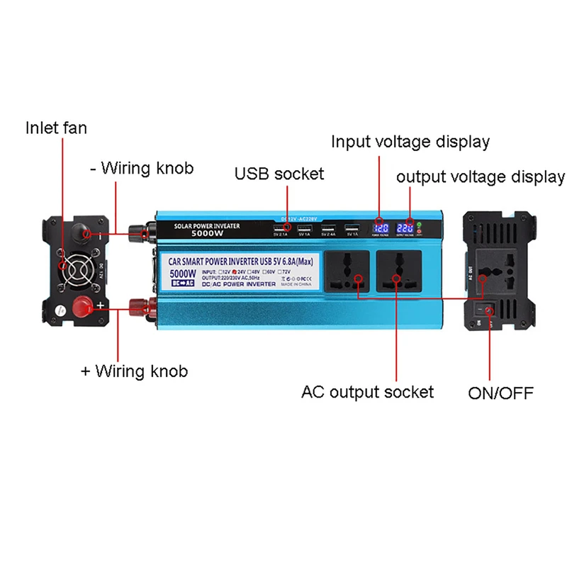 * [คลื่นไซน์ดัดแปลง5000W] แปลง12V DC เป็น AC 220V บ้านพร้อมเอาต์พุต950W ต่อเนื่อง (ความสามารถในการกระชาก5000W) พร้อมเต้ารับไฟฟ้ากระแสสลับ3เครื่องแสดงผลแรงดันไฟฟ้า LED สองตัวสี่อินเตอร์เฟซ USB หนึ่งขั้วกระแสตรงสูงและสองไฟ LED ทำงาน (โปรดตรวจสอบให้แน่ใจว่ากำลังไฟทั้งหมดของอุปกรณ์ที่เชื่อมต่ออยู่ที่ ≤ 950W)