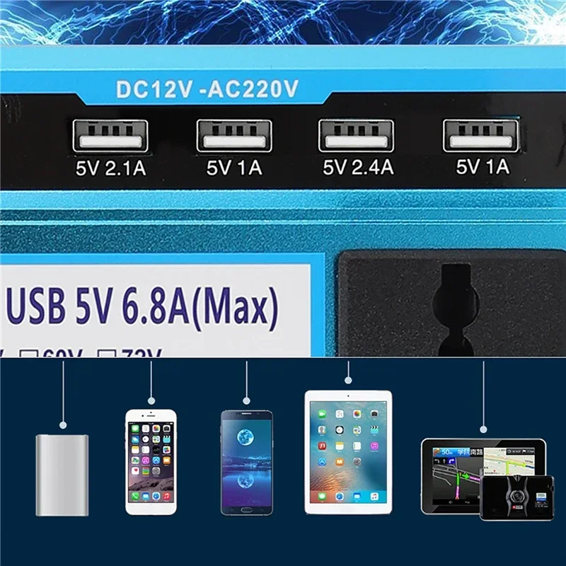 * [คลื่นไซน์ดัดแปลง4000W] แปลง12V DC เป็น AC 220V บ้านพร้อมเอาต์พุต750W ต่อเนื่อง (ความสามารถในการกระชาก4000W) พร้อมเต้ารับไฟฟ้ากระแสสลับ3เครื่องแสดงผลแรงดันไฟฟ้า LED สองตัวสี่อินเตอร์เฟซ USB หนึ่งขั้วกระแสตรงสูงและสองไฟ LED ทำงาน (โปรดตรวจสอบให้แน่ใจว่ากำลังไฟทั้งหมดของอุปกรณ์ที่เชื่อมต่ออยู่ที่ ≤ 750W)
