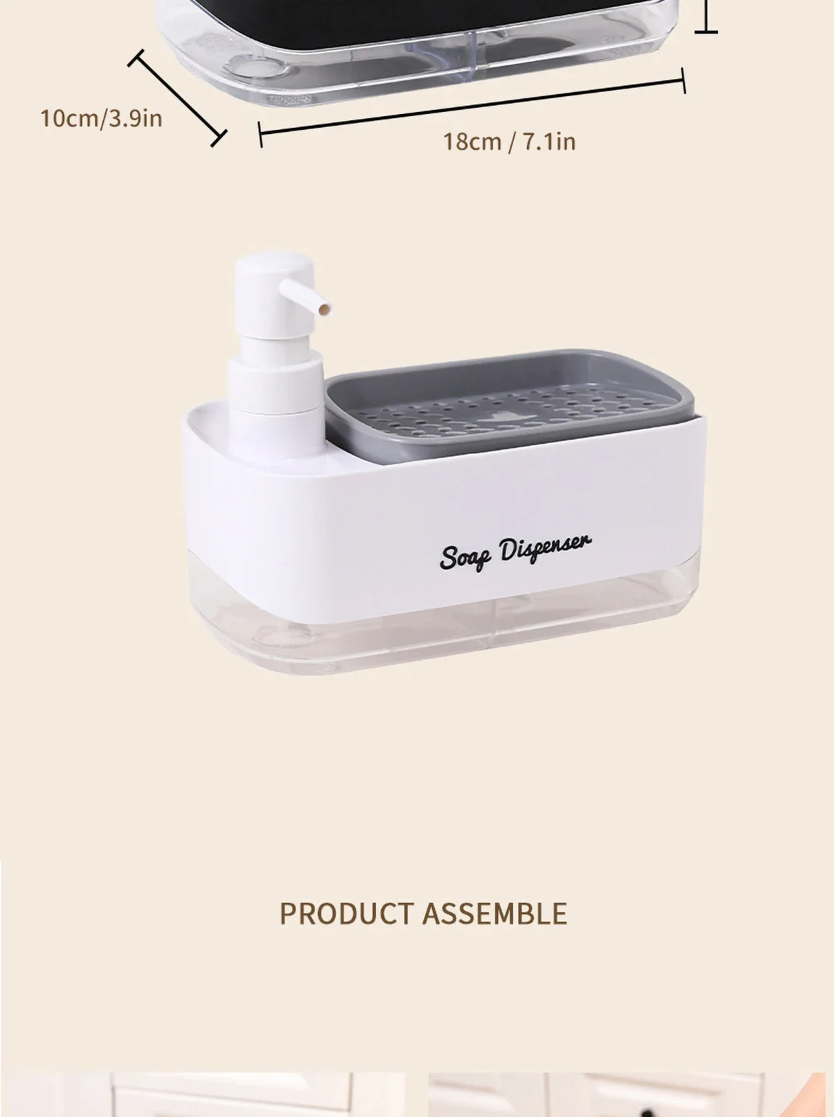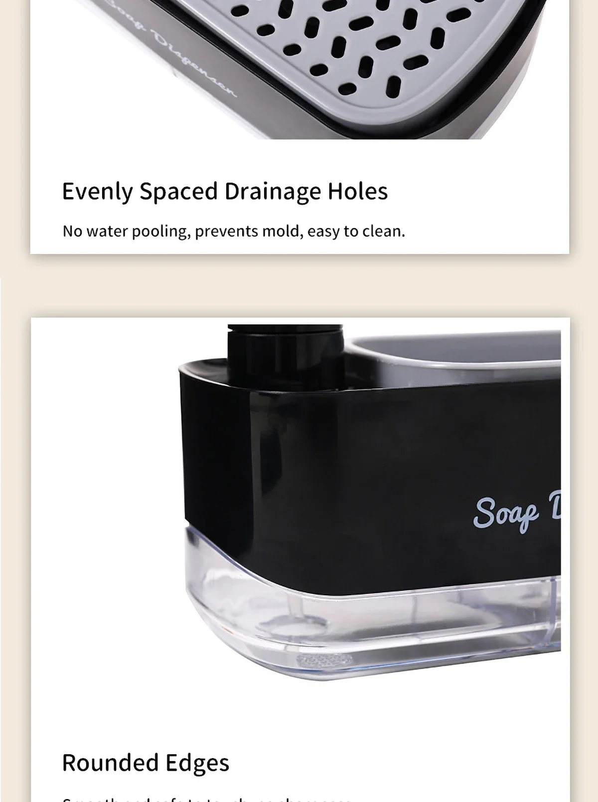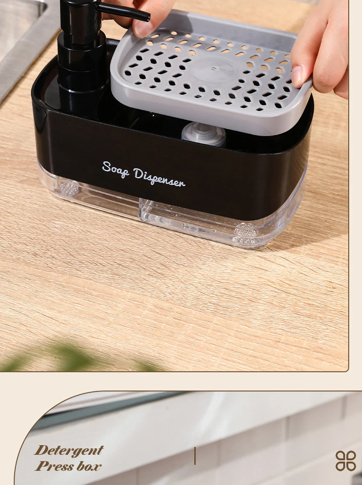 ฟังก์ชั่น 2-in-1: ตู้ทำสบู่นี้เพิ่มเป็นสองเท่าของที่วางฟองน้ำ ปรับปรุงการตั้งค่าอ่างล้างจานของคุณ