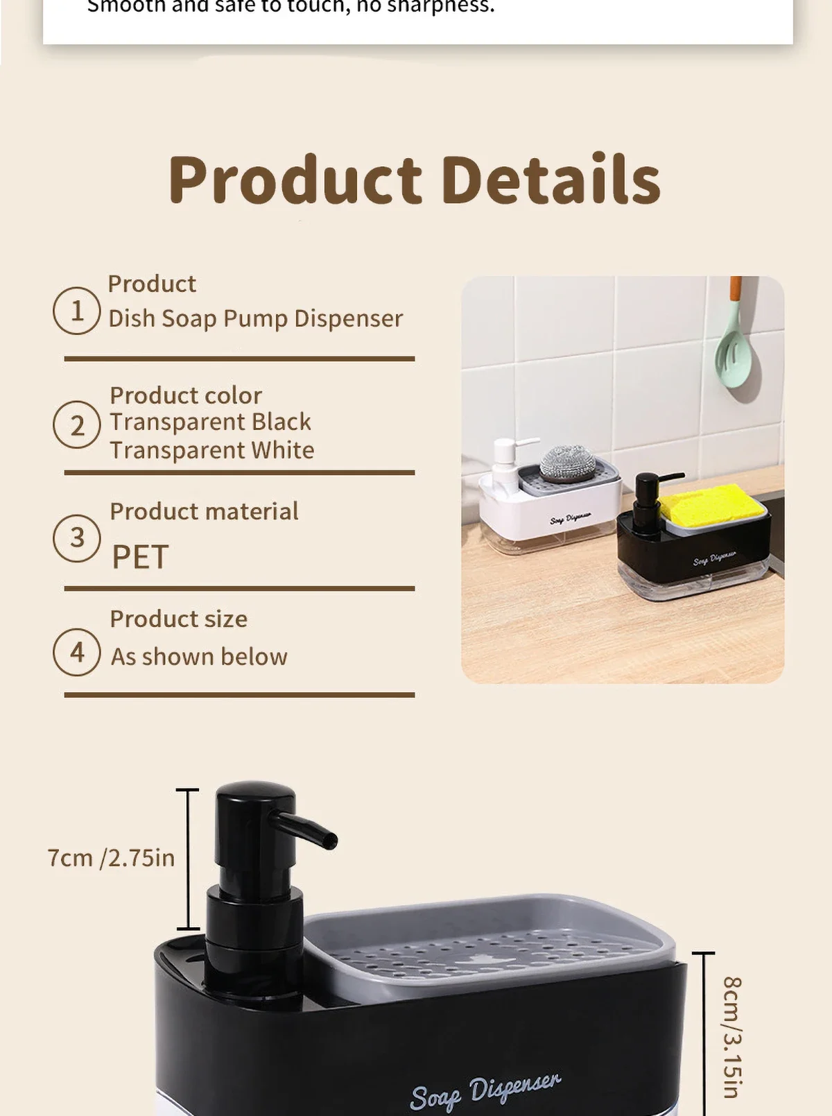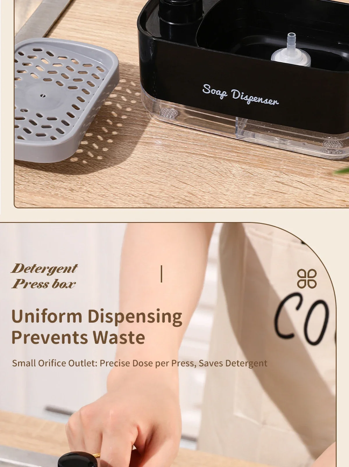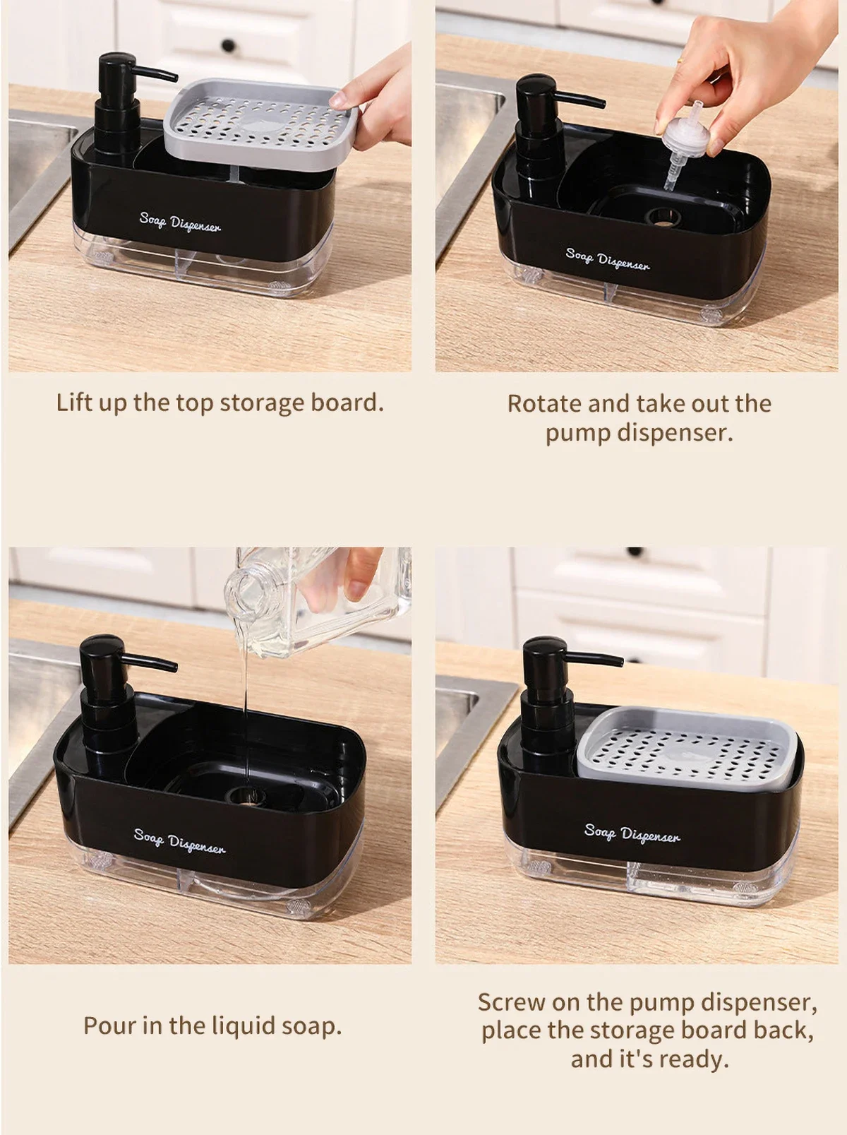 ฟังก์ชั่น 2-in-1: ตู้ทำสบู่นี้เพิ่มเป็นสองเท่าของที่วางฟองน้ำ ปรับปรุงการตั้งค่าอ่างล้างจานของคุณ