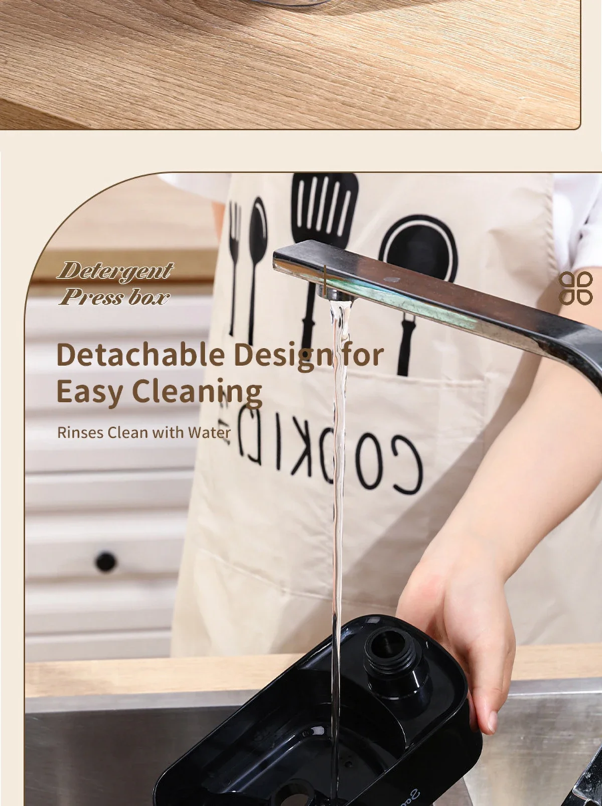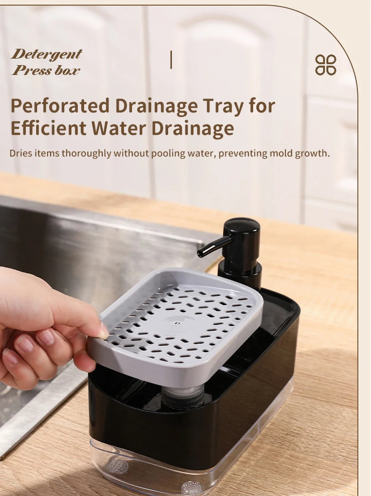 ที่จ่ายน้ำยาล้างจานแบบติดตั้งกับอ่างล้างจานในครัว พร้อมที่วางและอุปกรณ์เสริมสำหรับใช้ในบ้าน