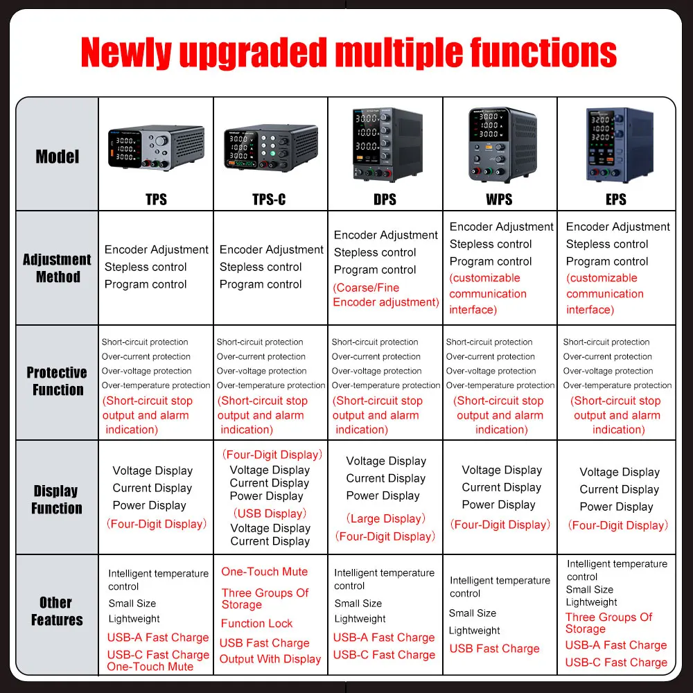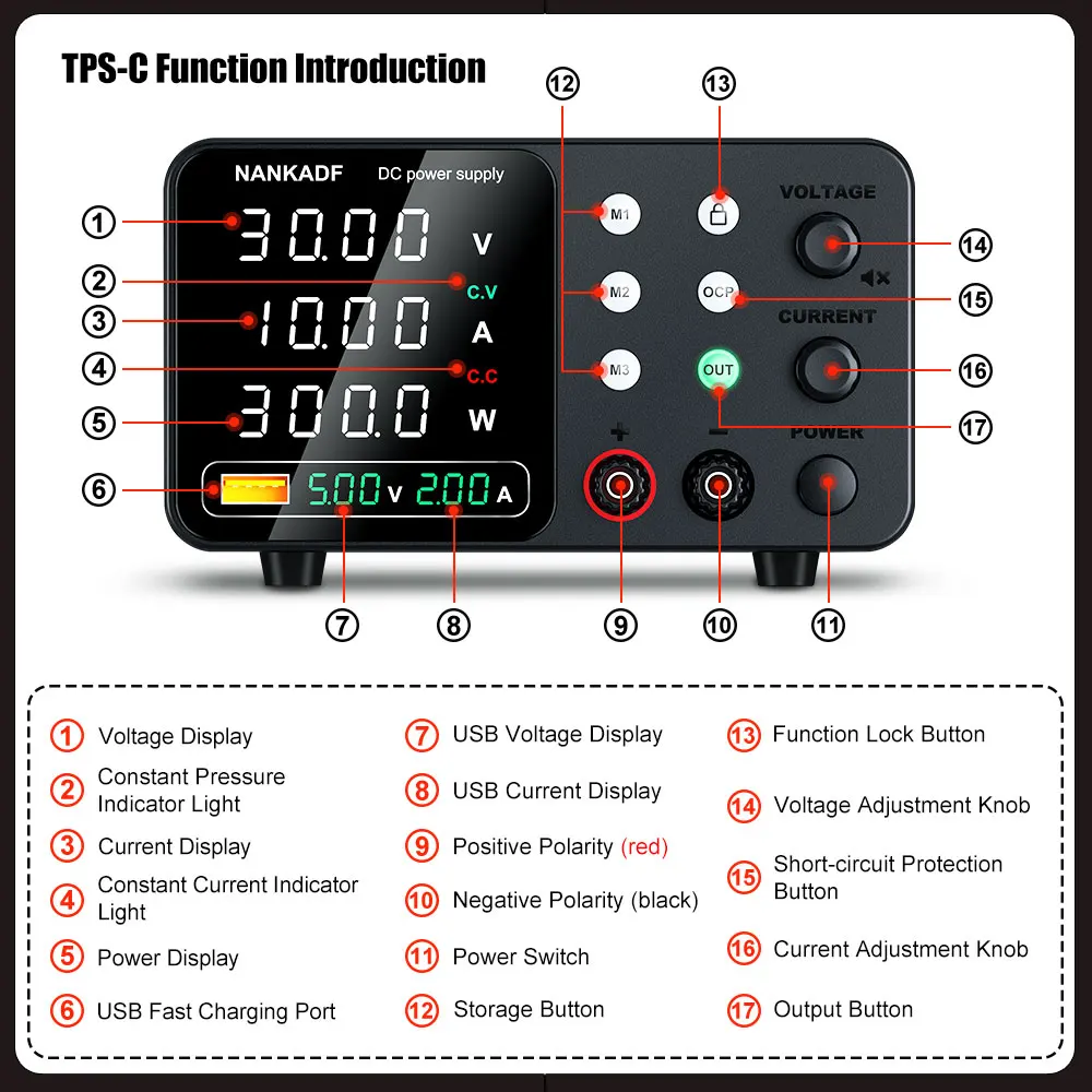 ผลิตภัณฑ์ซีรีส์ TPS เป็นแหล่งจ่ายไฟ DC ที่มีการควบคุมความแม่นยําสูงแบบสามหน้าต่าง สี่หลัก ซึ่งสามารถแสดงแรงดันไฟฟ้า กระแส และพลังงานได้พร้อมกันผลิตภัณฑ์เหล่านี้ใช้กันอย่างแพร่หลายในการซ่อมโทรศัพท์มือถือ การซ่อมแซมคอมพิวเตอร์ การชาร์จแบตเตอรี่ การสอนในโรงเรียน และการใช้งานสายการผลิตด้วยการใช้โพเทนชิออมิเตอร์ที่เข้ารหัส แรงดันเอาต์พุตและกระแสเอาต์พุตสามารถปรับได้อย่างต่อเนื่องระหว่าง 0 ถึงค่าที่กําหนด และสามารถแสดงค่าที่ตั้งไว้ล่วงหน้าได้เพื่อความสะดวกในการใช้งานและการปรับแต่งอุปกรณ์นี้มีฟังก์ชันการชาร์จที่รวดเร็ว USB-A/Type-C และรองรับโปรโตคอลการชาร์จที่รวดเร็วหลายแบบมีการป้องกันแรงดันไฟฟ้าเกิน (OVP) ที่สมบูรณ์แบบ การป้องกันกระแสเกิน (OCP) และวงจรป้องกันการลัดวงจร ทําให้มั่นใจได้ถึงเสถียรภาพของพลังงานที่ดีเยี่ยมและค่าสัมประสิทธิ์การกระเพื่อมต่ําขนาดกะทัดรัด การออกแบบน้ําหนักเบา และความสวยงามทําให้ใช้งานง่าย และสามารถทํางานได้อย่างต่อเนื่องภายใต้โหลดเต็มเป็นระยะเวลานาน ทําให้เป็นที่นิยมอย่างมากในหมู่ผู้ใช้