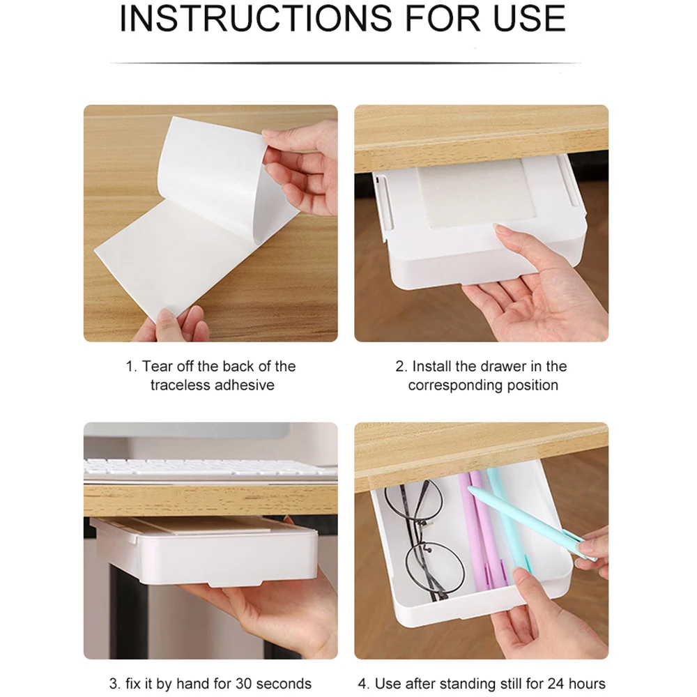 【ง่ายต่อการติดตั้ง】กล่องเก็บของมาพร้อมกับสติกเกอร์5ชิ้น คุณเพียงแค่ต้องลอกฟิล์มของสติกเกอร์ออกและวางลงในตำแหน่งที่ต้องการแก้ไขลิ้นชักแบบมีกาวในตัวใต้โต๊ะและปล่อยให้มันยืนเป็นระยะเวลาหนึ่งก่อนใช้งาน