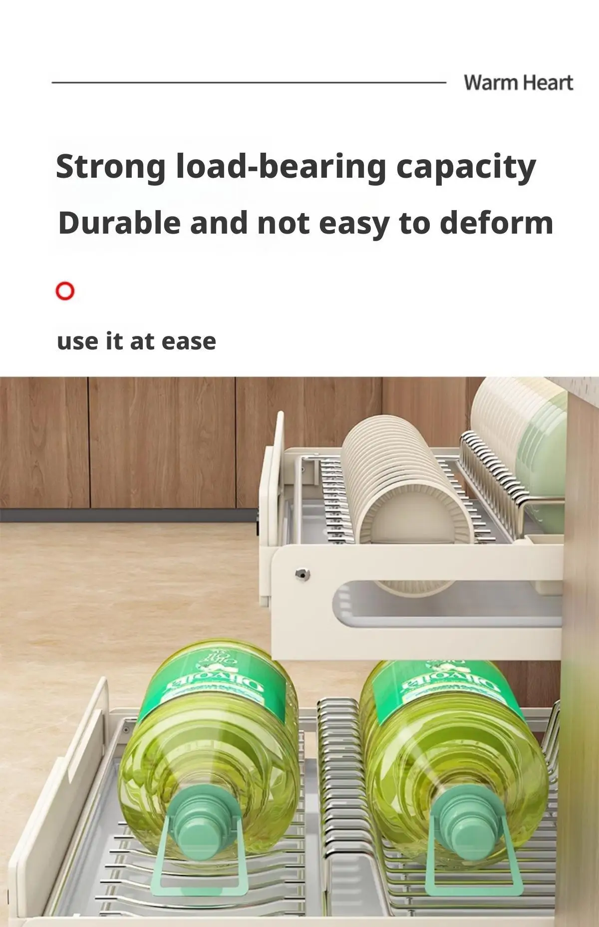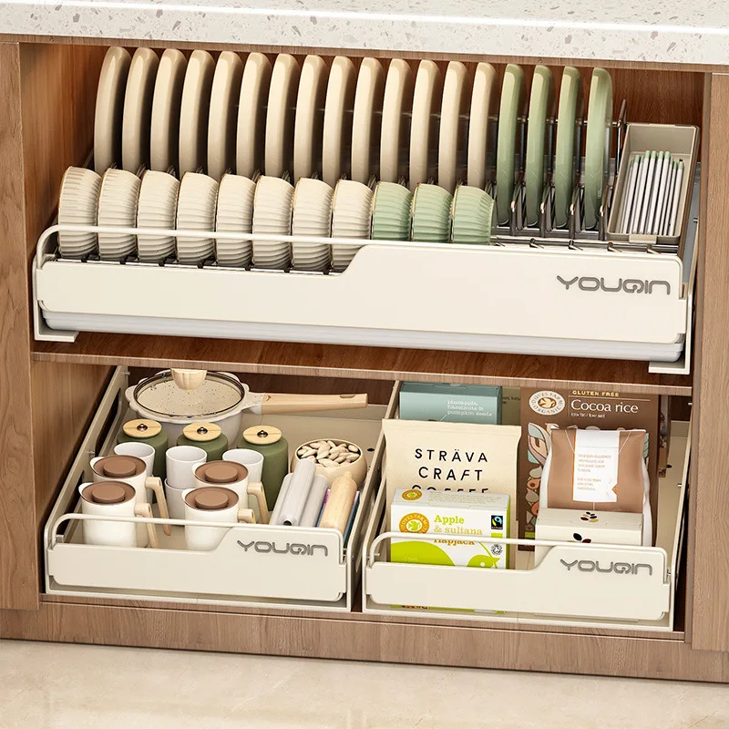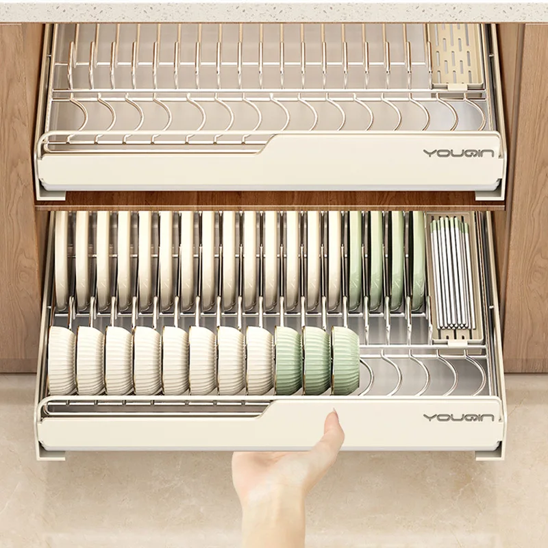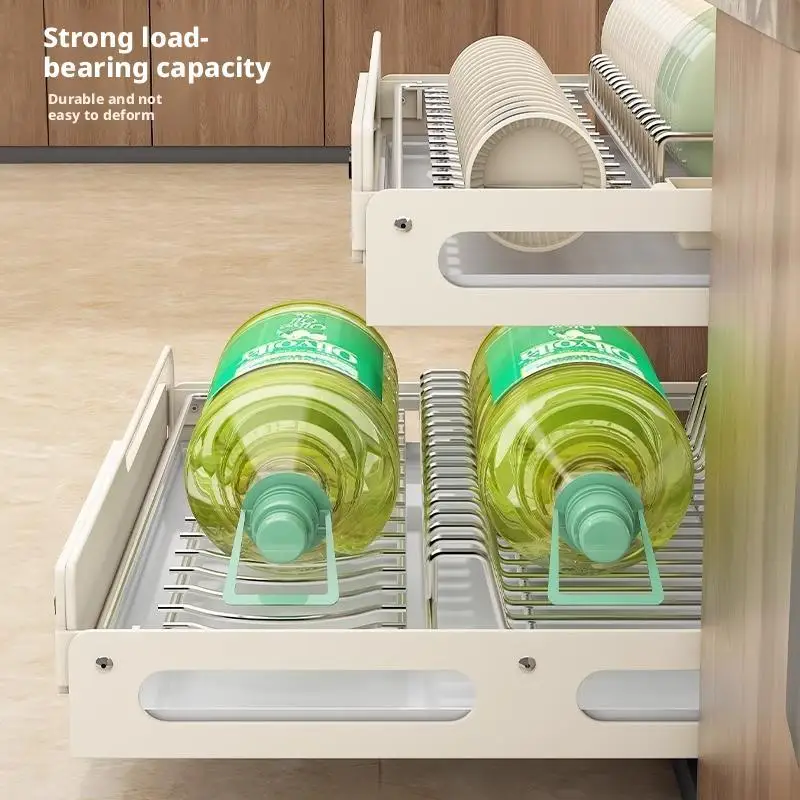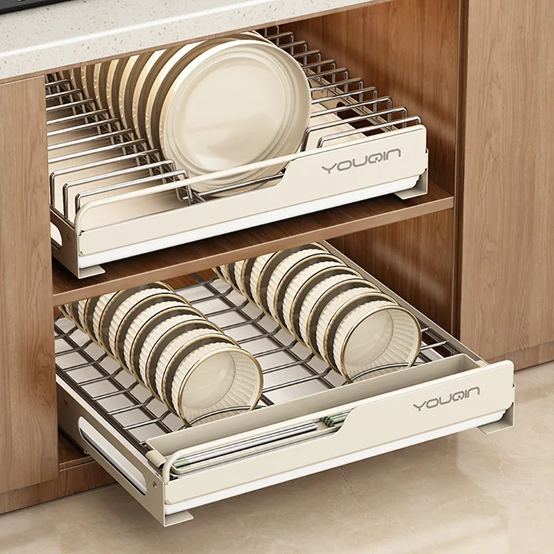 ชั้นเก็บจานสแตนเลสดึงตะกร้าจานชามท่อระบายน้ําห้องครัวตู้ลิ้นชักเลื่อนผู้ถือ Organizer Rack