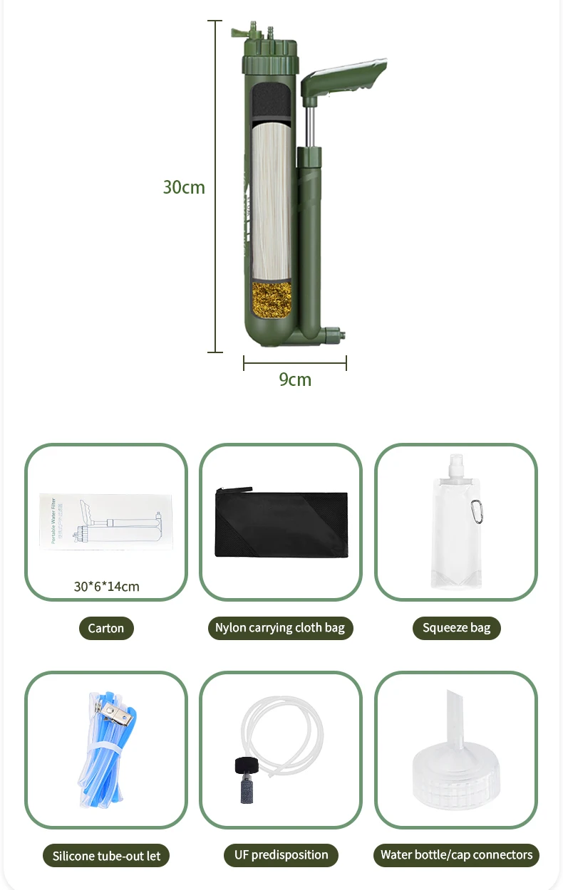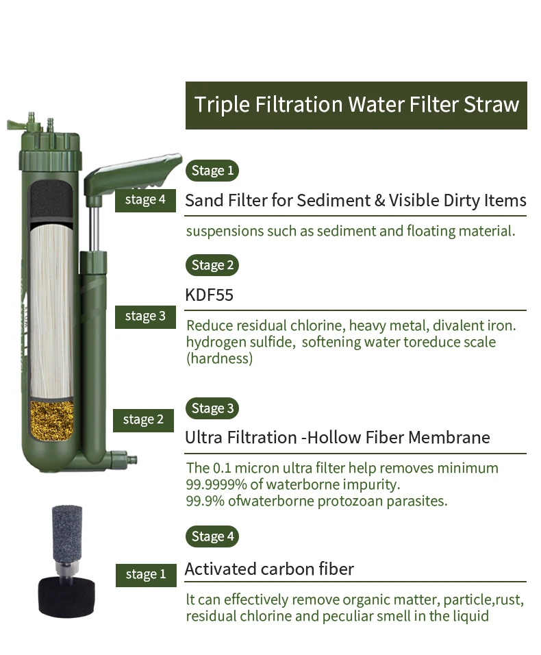 ไม่ นี่เป็นผลิตภัณฑ์ฉุกเฉินกลางแจ้งที่สามารถกรองน้ําไหลทั่วไปที่กล่าวถึงข้างต้นได้กรุณาใช้ผลิตภัณฑ์นี้อย่างถูกต้อง ปัสสาวะสามารถกรองได้ (กรองรีเวิร์สออสโมซิสและดับกลิ่นปัสสาวะ) ไม่สามารถกรองสารกําจัดศัตรูพืชได้ (สารกําจัดศัตรูพืชตกค้างสามารถกําจัดออกได้ – ไม่อยู่ในความเข้มข้นสูง)