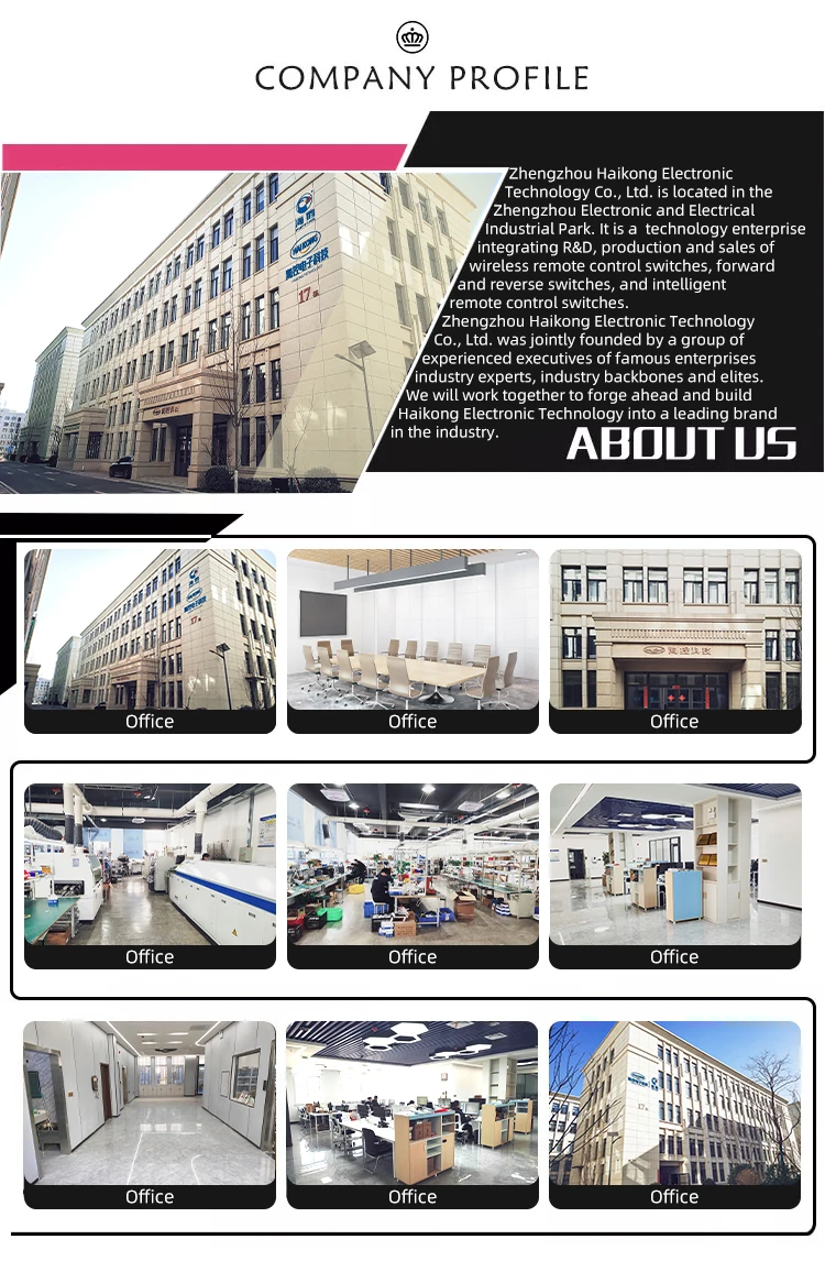 Shengzhou Haikong แผงควบคุมไฟฟ้า Co., Ltd. ตั้งอยู่ในสวนอิเล็กทรอนิกส์และไฟฟ้าเจิ้งโจว เป็นบริษัทเทคโนโลยีที่รวม R & D การผลิตและการจำหน่ายสวิตช์ควบคุมระยะไกลไร้สายสวิตช์เดินหน้าและถอยหลัง
