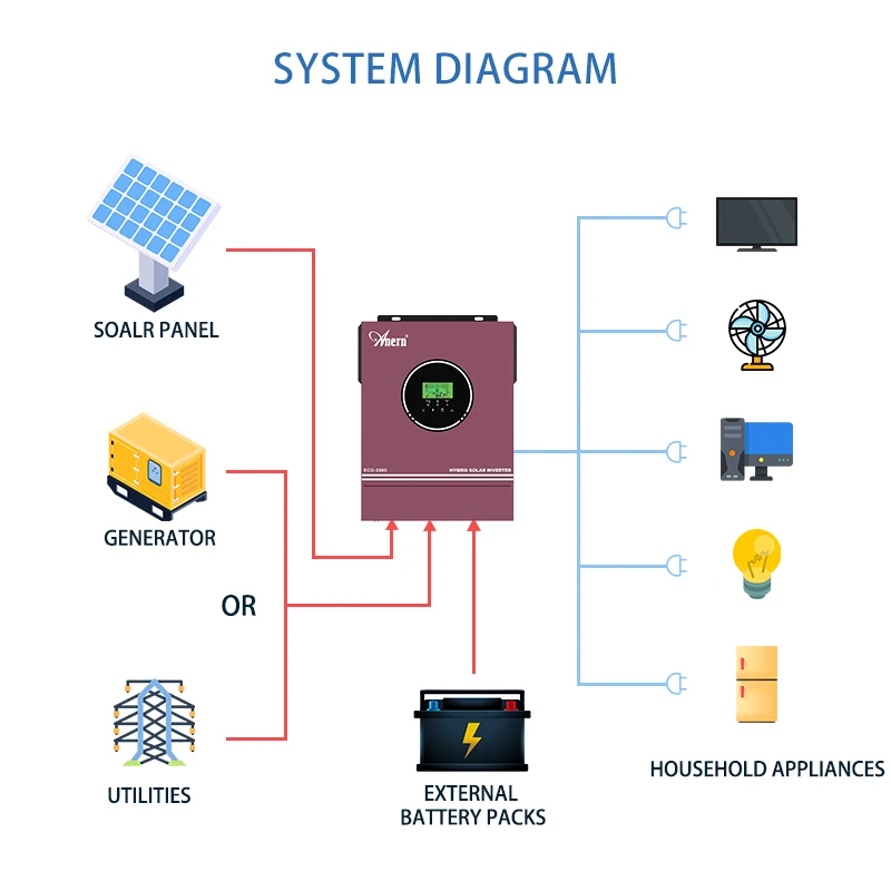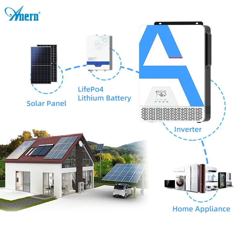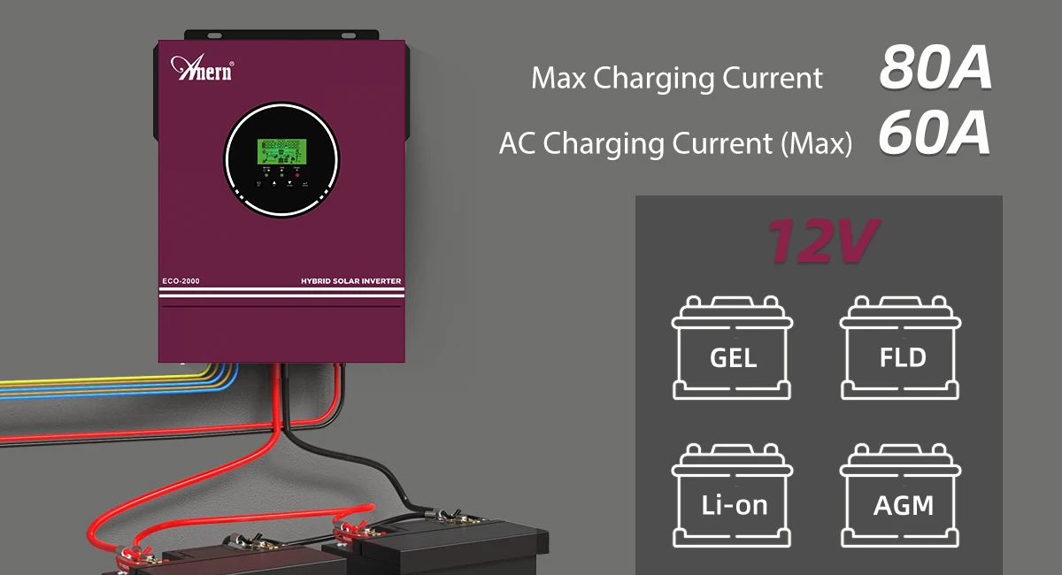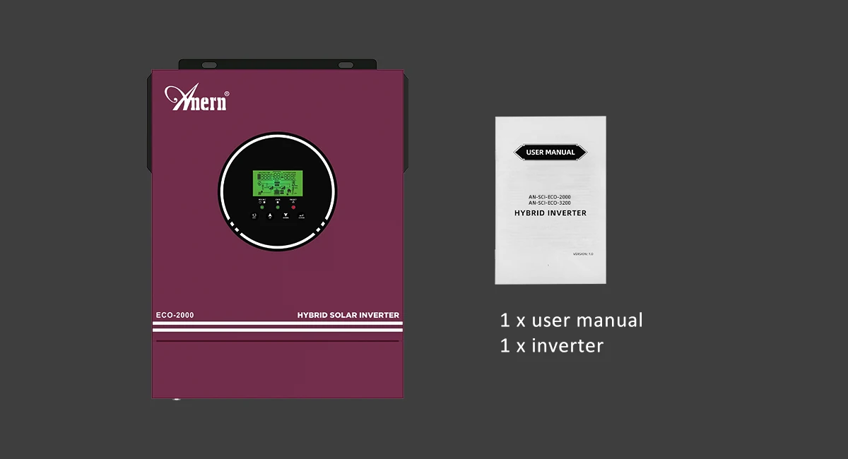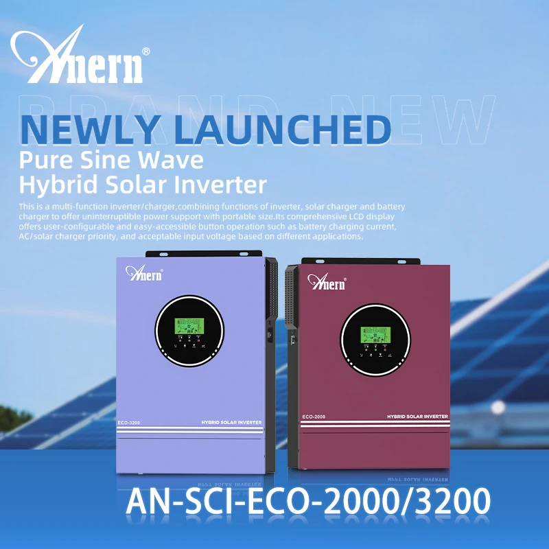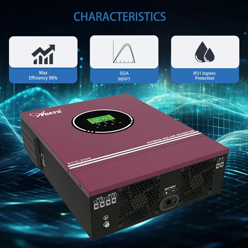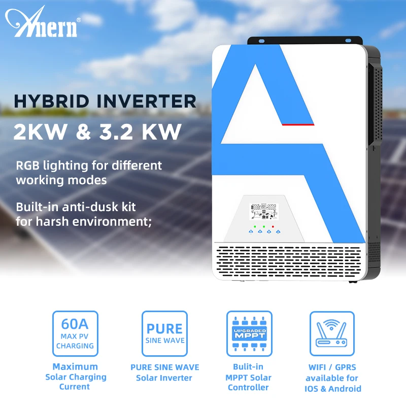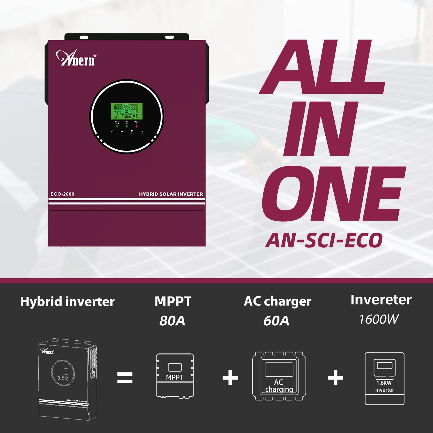อินเวอร์เตอร์ไฮบริดพลังงานแสงอาทิตย์ Anern 1.6KW 2KW 3KW 3.2KW 12V 24V คลื่นไซน์บริสุทธิ์ ออฟกริด อินเวอร์เตอร์ MPPT 80A 140A MAX PV 400Vdc 150Vdc