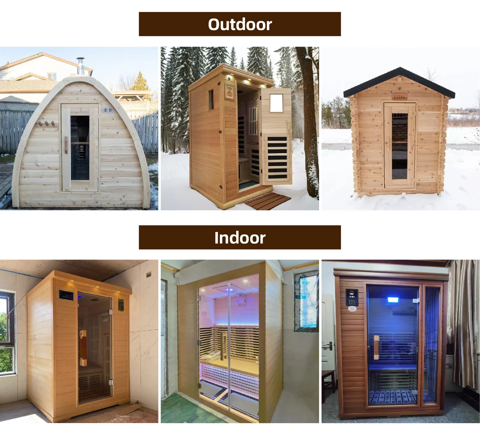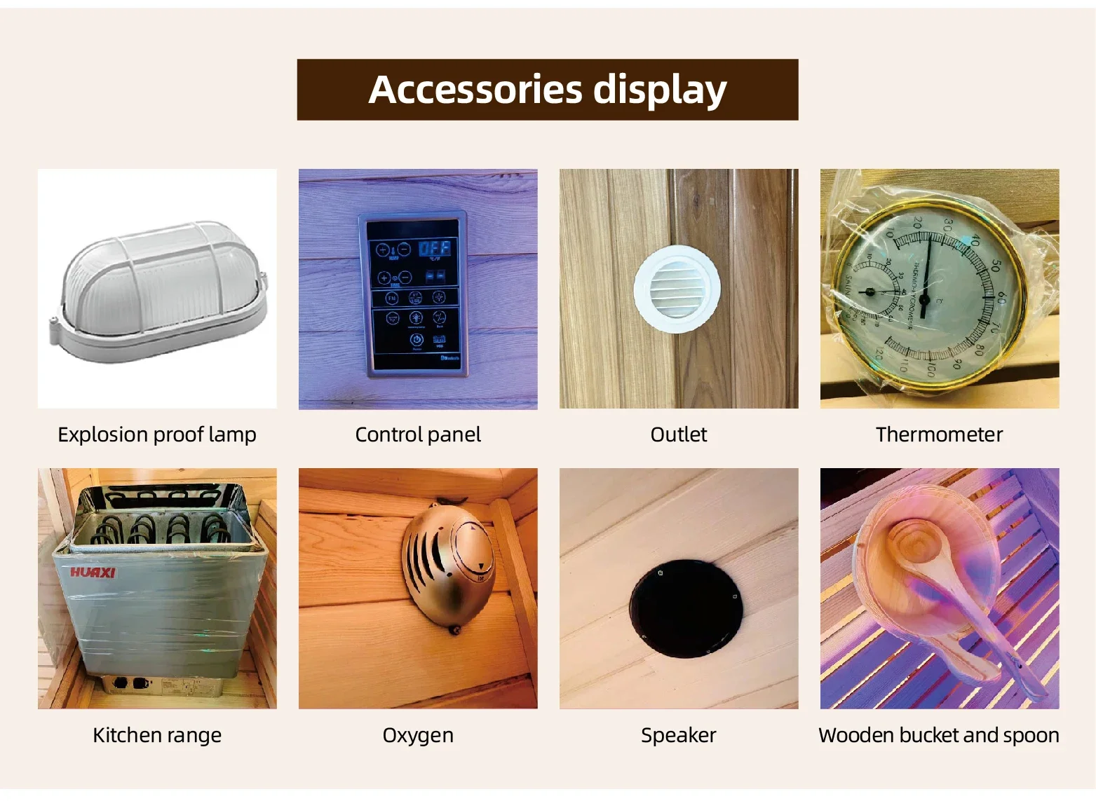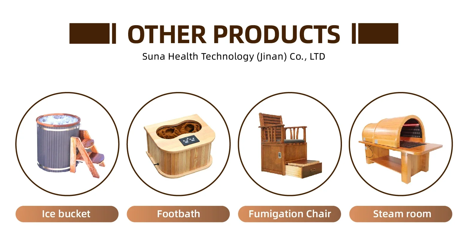 ถังซาวน่า/ ทัพพี/ ตัวจับเวลาทราย/ พนักพิง/ พนักพิงศีรษะ/ เครื่องวัดอุณหภูมิและไฮโกรมิเตอร์/ หินซาวน่า ฯลฯ อุปกรณ์ซาวน่า |