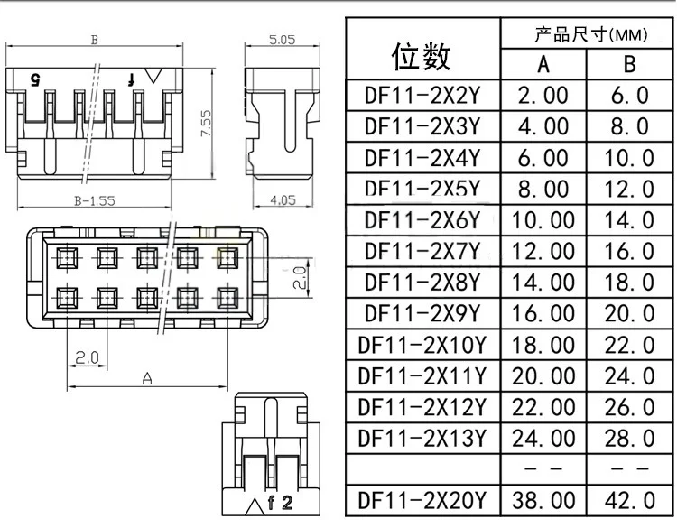 DF11 ขั้วต่อเปลือกพลาสติกสองแถว Pitch 2.0 มม