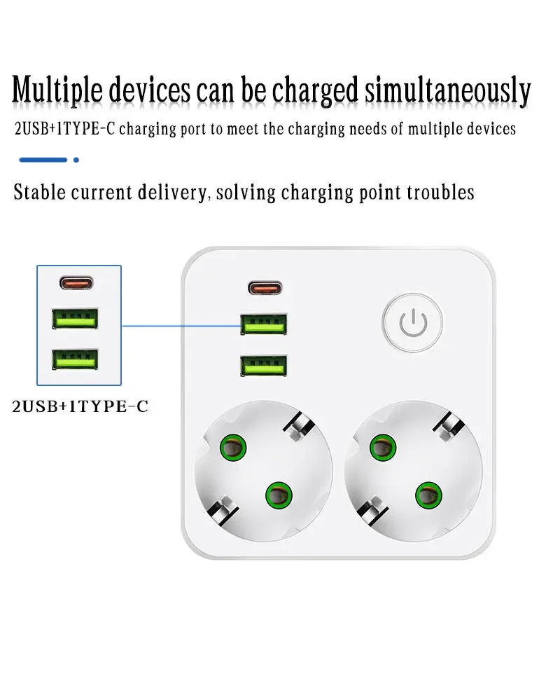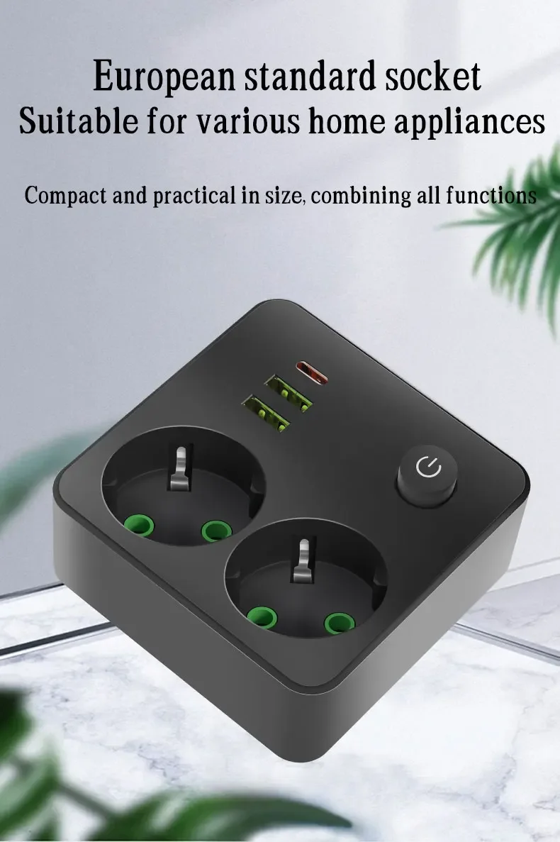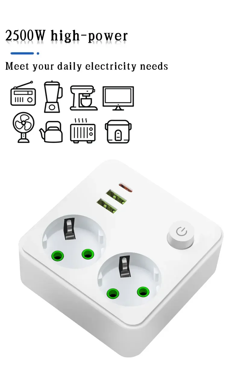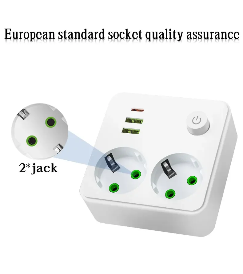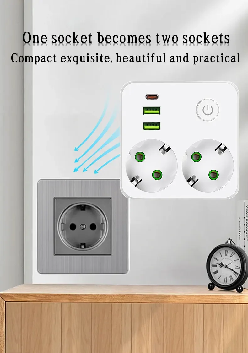 EU Plug Outlet 2 ซ็อกเก็ต Multitap Wall Power Strip ซ็อกเก็ตไฟฟ้าไม่มีสายไฟต่อ 2 USB 1 พอร์ต Type-C 2500W MAX Power