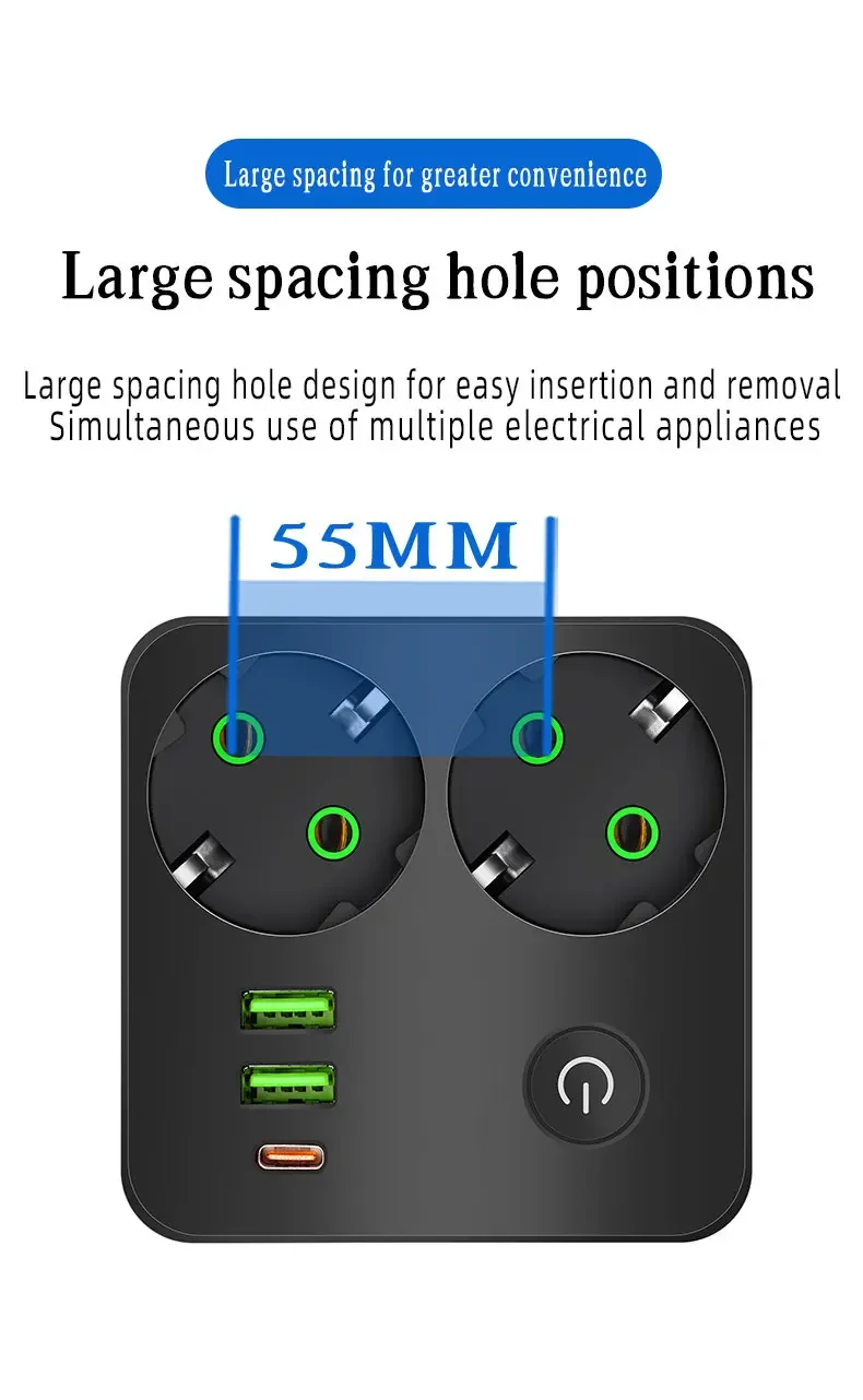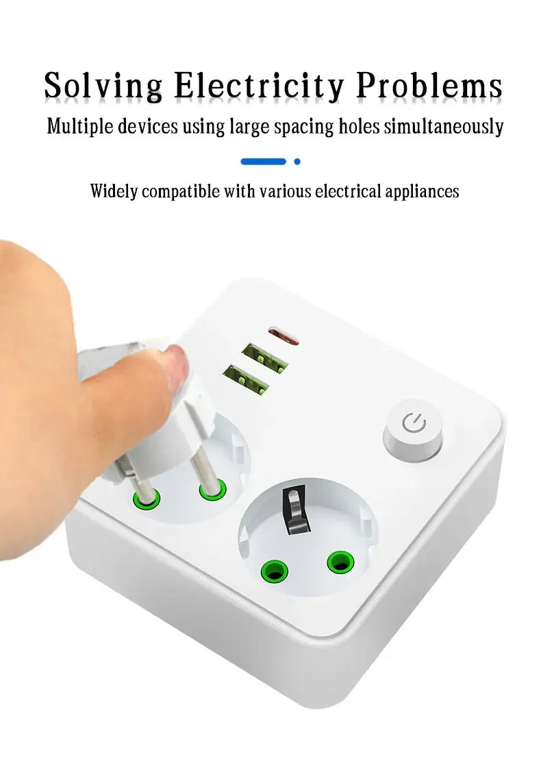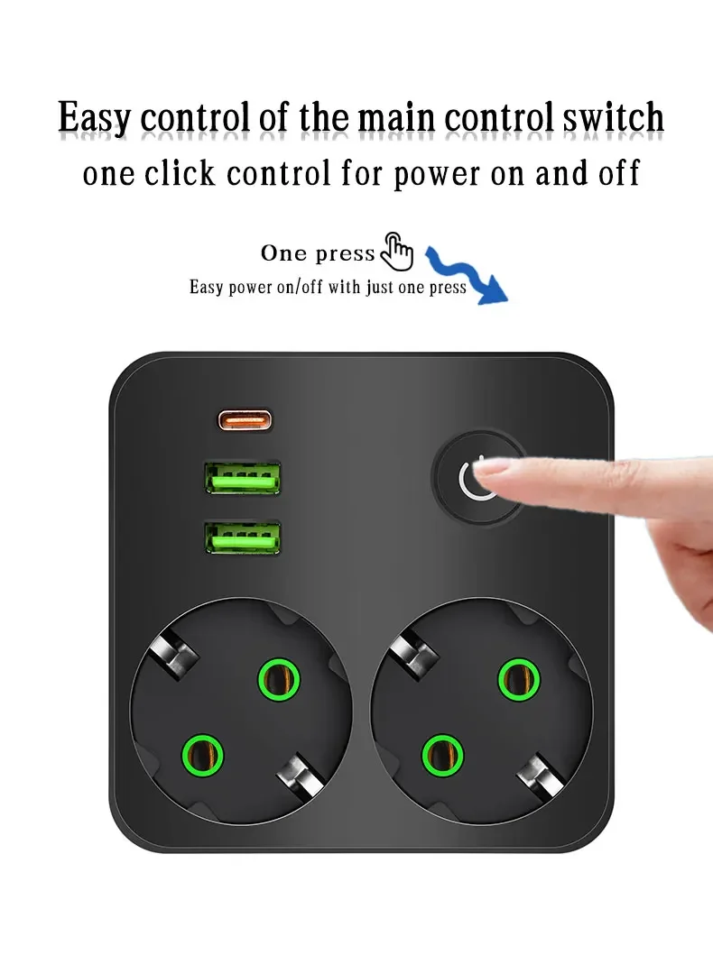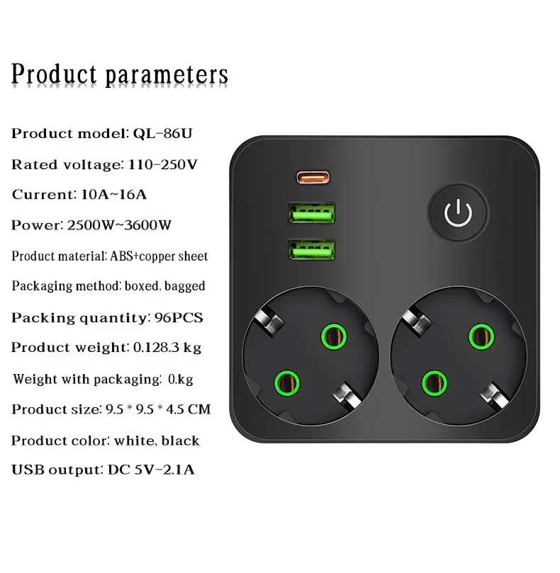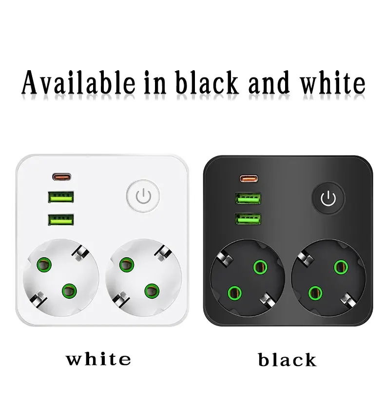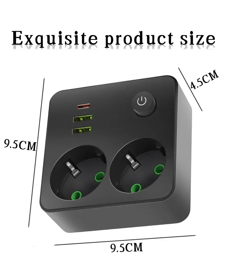 EU Plug Outlet 2 ซ็อกเก็ต Multitap Wall Power Strip ซ็อกเก็ตไฟฟ้าไม่มีสายไฟต่อ 2 USB 1 พอร์ต Type-C 2500W MAX Power