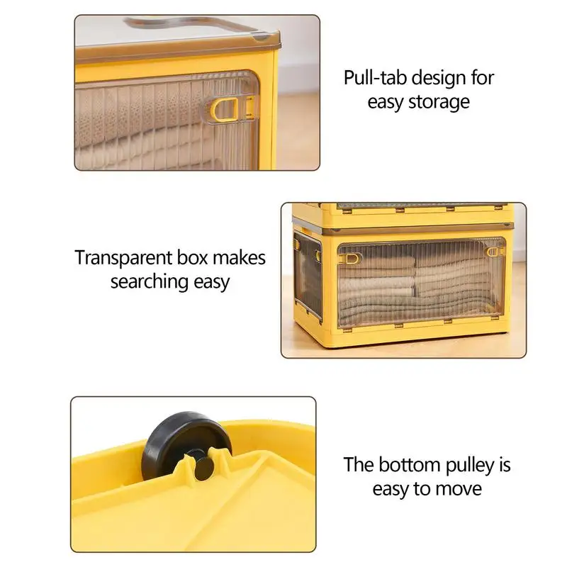 1. มีล้อ: รอกด้านล่างเพื่อการเคลื่อนย้ายถังเก็บของแบบพับได้ของเราพร้อมประตูใสได้อย่างง่ายดายบอกลาโซลูชันการจัดเก็บข้อมูลที่ล้ําสมัยไปได้เลย