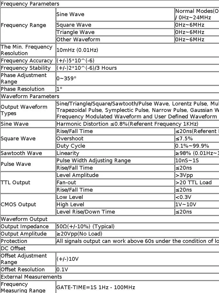 6.ช่วงความกว้างของสัญญาณเอาท์พุตคือ10mVpp- 20Vpp, ช่วงการปรับออฟเซ็ต DC คือ -10V ถึง 10V ความละเอียดคือ 0.1V