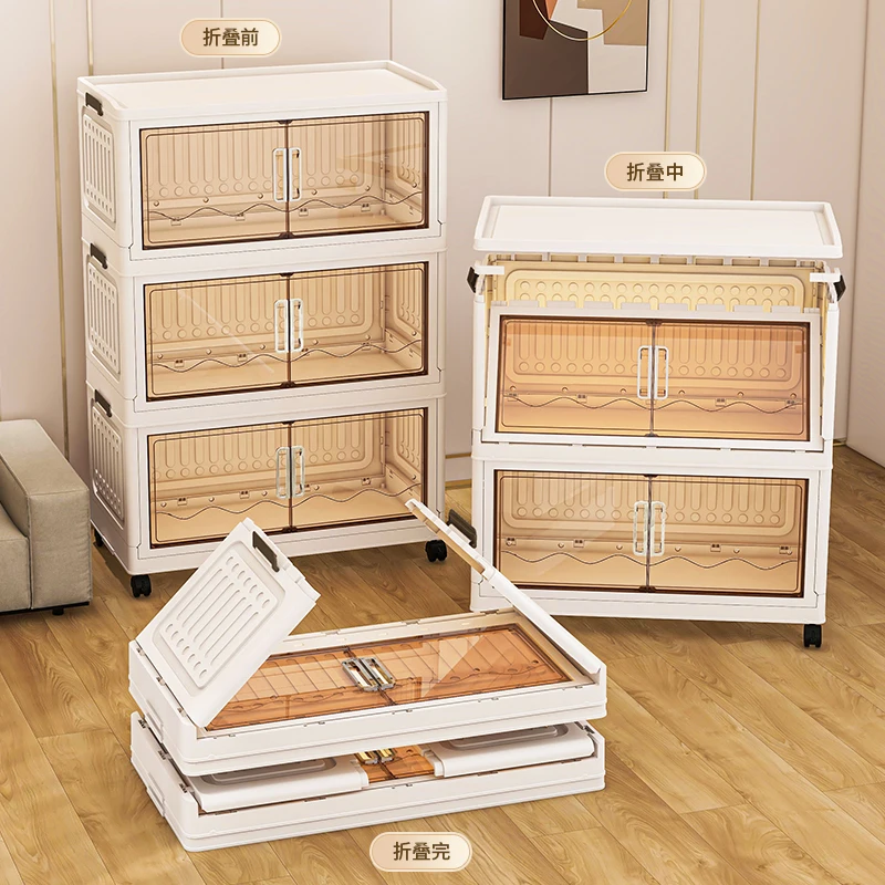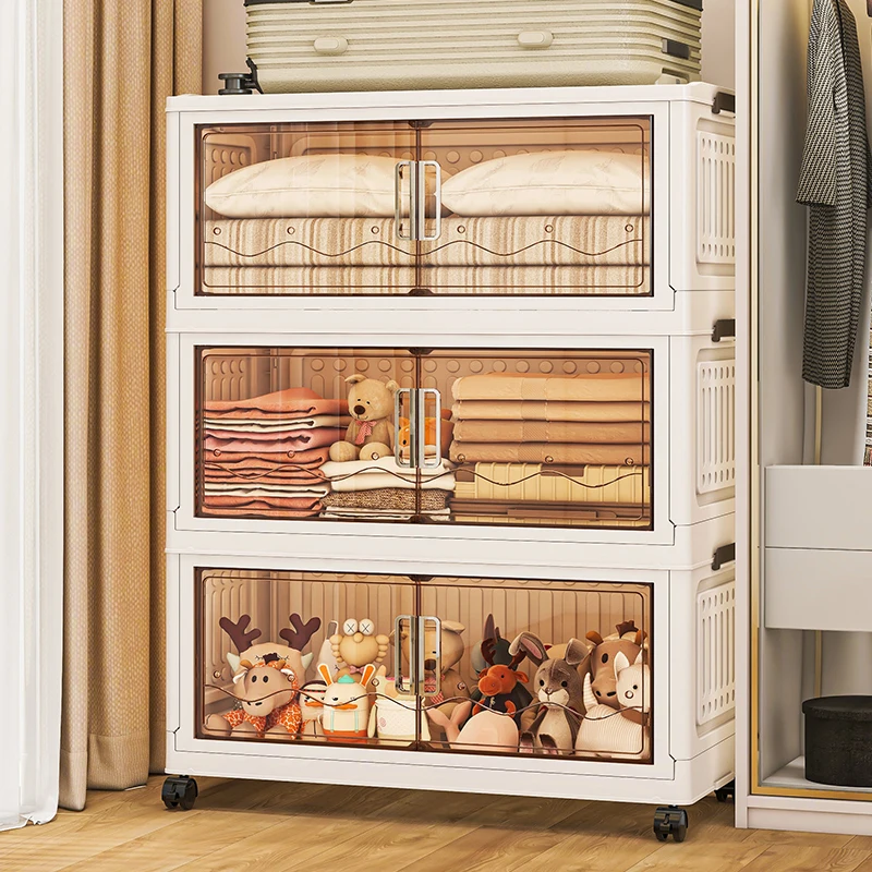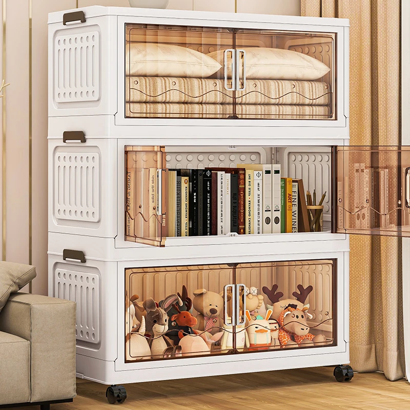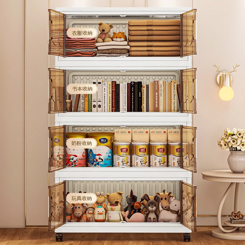 กล่องเก็บของแบบพับได้, ตู้เก็บของพลาสติกแบบสองประตูสำหรับห้องนอนในบ้าน, กล่องเก็บของหลายชั้นสำหรับของเล่น, ขนม และเสื้อผ้าแบบมีฝาปิด