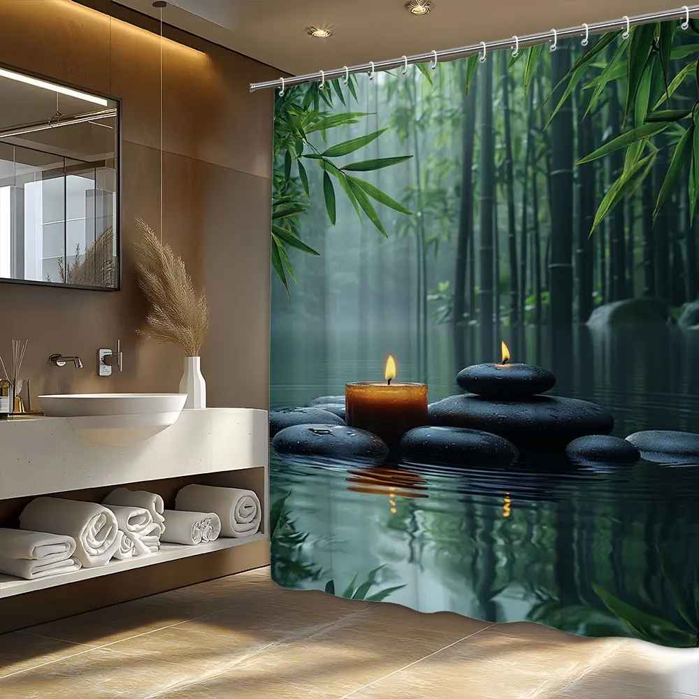 ม่านอาบน้ําป่าไม้ไผ่ผ่อนคลายสําหรับห้องน้ําเซน มีน้ําเงียบสงบ หิน และเทียน นี่เงียบ
