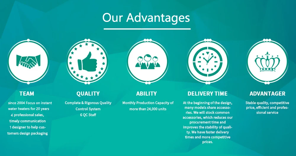 ผลิตภัณฑ์หลักของเราคือ: เครื่องทําน้ําอุ่นไฟฟ้าทันที (สําหรับใช้ในบ้านในอพาร์ทเมนต์ของโรงแรมและร้านทําผม) เช่น สมบัติในครัวขนาดเล็กแบบเก็บความร้อน (สากลสําหรับห้องครัวและห้องน้ํา) เครื่องทําน้ําอุ่นและผลิตภัณฑ์อื่น ๆบริษัทมีความสามารถในการวิจัยและพัฒนาที่เป็นอิสระ และผลิตภัณฑ์ของบริษัทได้รับสิทธิบัตรเทคโนโลยีและสิทธิบัตรรูปลักษณ์ที่เกี่ยวข้อง รวมถึงการรับรองคุณสมบัติที่เกี่ยวข้องบริษัทมีสายการผลิตหลายสาย และกําลังการผลิตสามารถตอบสนองความต้องการในการจัดซื้อจํานวนมากของลูกค้า และสามารถรับคําสั่งซื้อ OEM และ ODM ได้