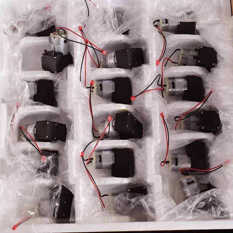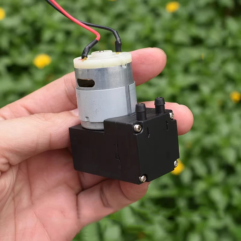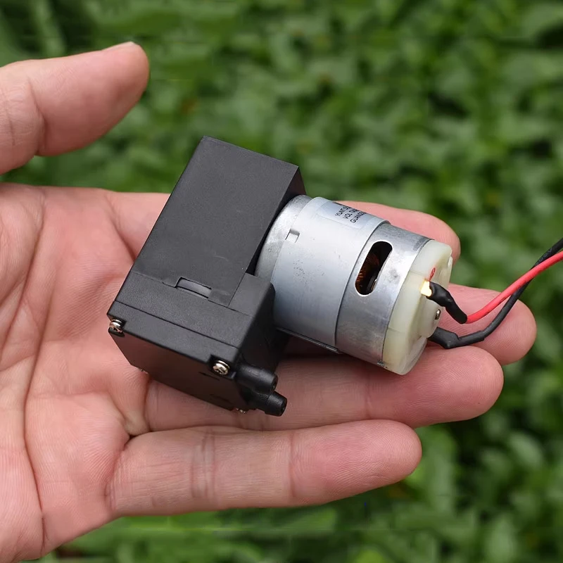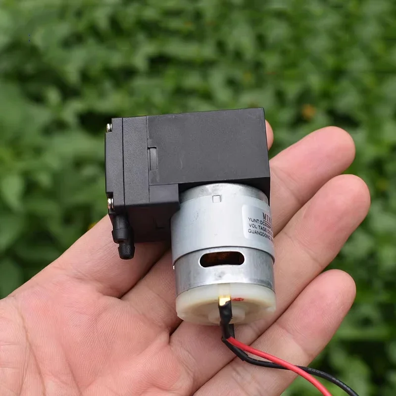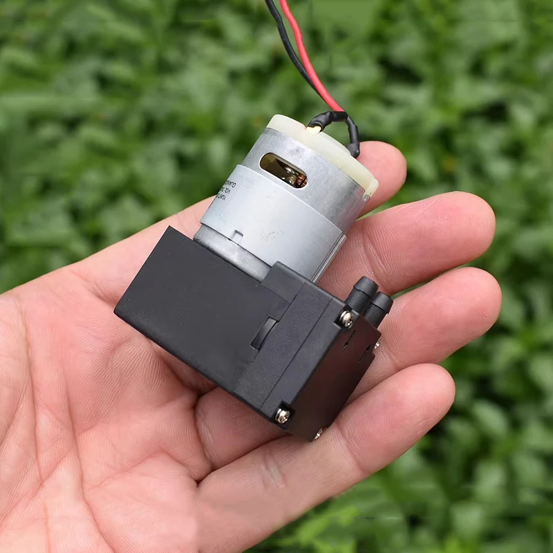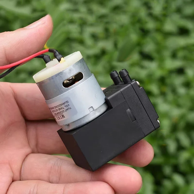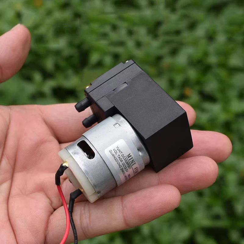 ปั๊มไดอะแฟรมขนาดเล็ก, ปั๊มแรงดันลบ, ปั๊มลม, ปั๊มของเหลว, สามารถดูดของเหลวได้เอง, ใช้งานได้ทั้งเป็นปั๊มสุญญากาศหรือปั๊มลม, แรงดันไฟฟ้าที่เหมาะสมคือ DC12V, และมอเตอร์เป็นมอเตอร์รุ่น 385