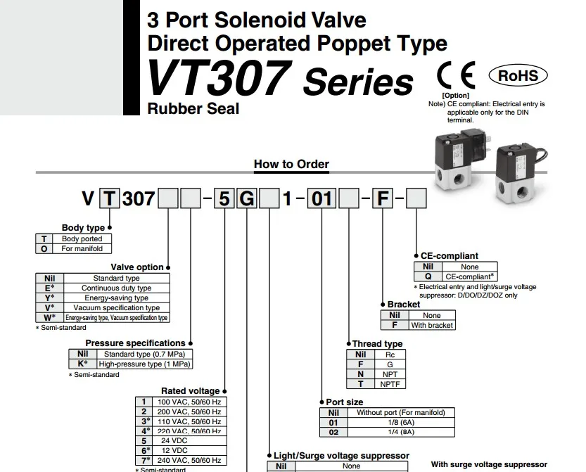 วาล์วแม่เหล็กไฟฟ้าความถี่สูงแบบสุญญากาศ VT307 5G1 01 VT307V-5G1-02 VT307V VT307-4G1-02 VT307-6G1-01