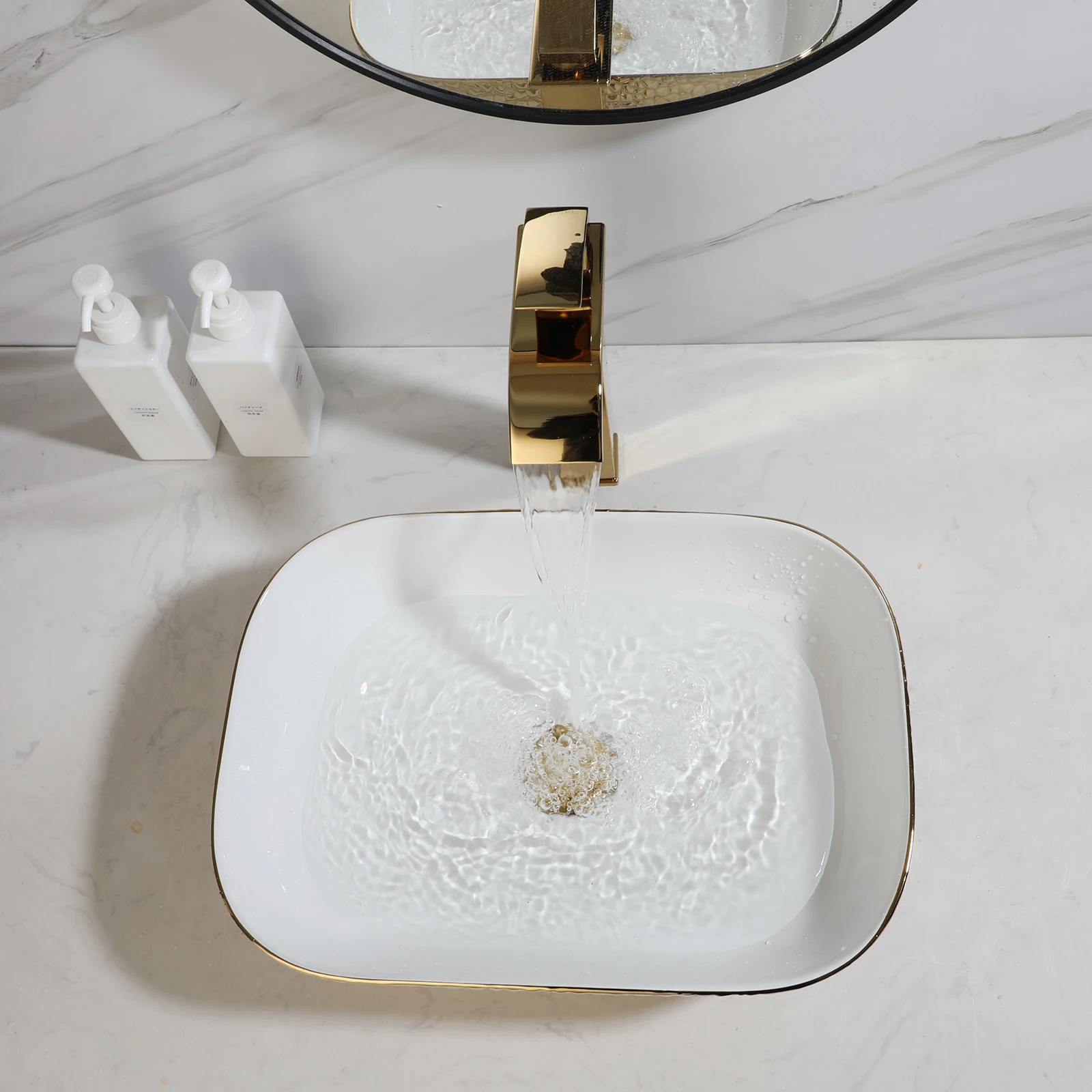 เหมาะสําหรับห้องน้ําสมัยใหม่: อ่างล้างจานในห้องน้ําเซรามิกนี้เข้ากันได้อย่างลงตัวกับพื้นที่ร่วมสมัย ทําให้เป็นตัวเลือกอันดับต้นๆ ในบรรดาอ่างล้างจานทองสําหรับการอัพเกรดห้องน้ํา