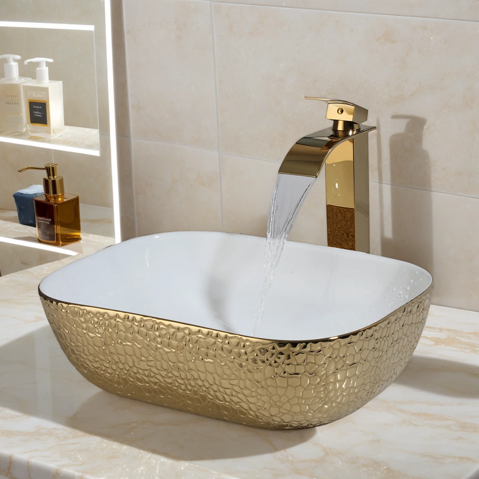 การออกแบบที่หรูหราระดับไฮเอนด์: อ่างล้างจานทรงสี่เหลี่ยมสีทองและสีขาวผลิตจากเซรามิกระดับพรีเมียม โดดเด่นด้วยรูปลักษณ์ภายนอกที่หรูหราซึ่งช่วยเพิ่มความสง่างามของห้องน้ําสมัยใหม่