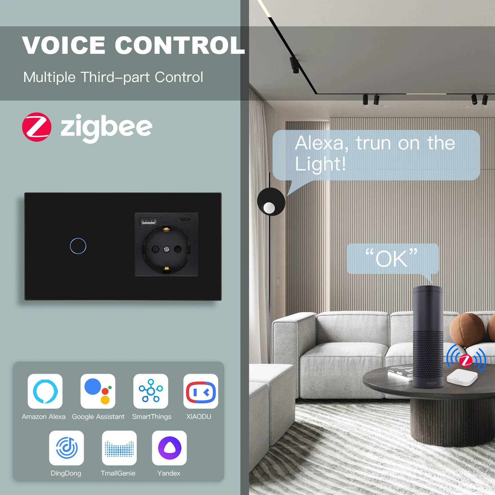 BSEED Zigbee 1/2/3Gang สมาร์ทสวิทช์สัมผัส Tuya Smart Life Alexa App Plus ปลั๊กไฟผนัง USB Type-c พอร์ต EU มาตรฐาน