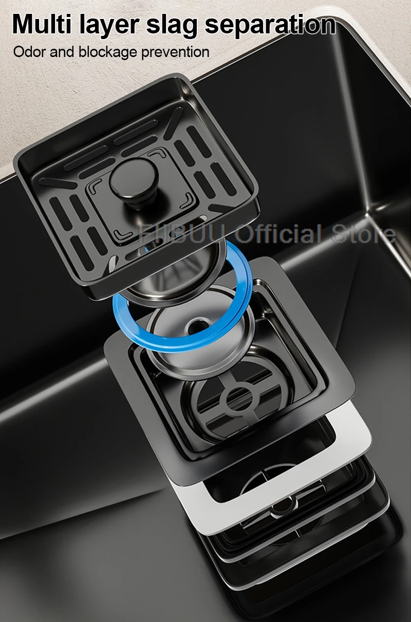 【Anti-clogging and anti-odor】The drain filter of our kitchen sink features a multi-layer design. This design effectively filters kitchen waste, ensuring rapid drainage while preventing unpleasant odors. It employs advanced filtration technology to maintain a clean and odor-free environment.
