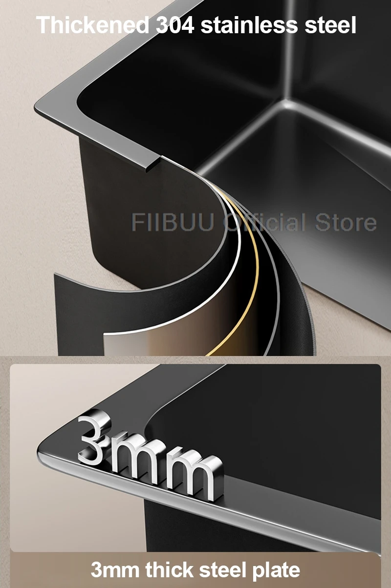 【High quality material】 Constructed from top-grade 304 stainless steel with enhanced thickness reinforcement, our sinks exhibit exceptional resistance to deformation. They offer remarkable hardness and durability. The application of nano-coating not only enhances wear resistance but also reduces bacterial residue accumulation.