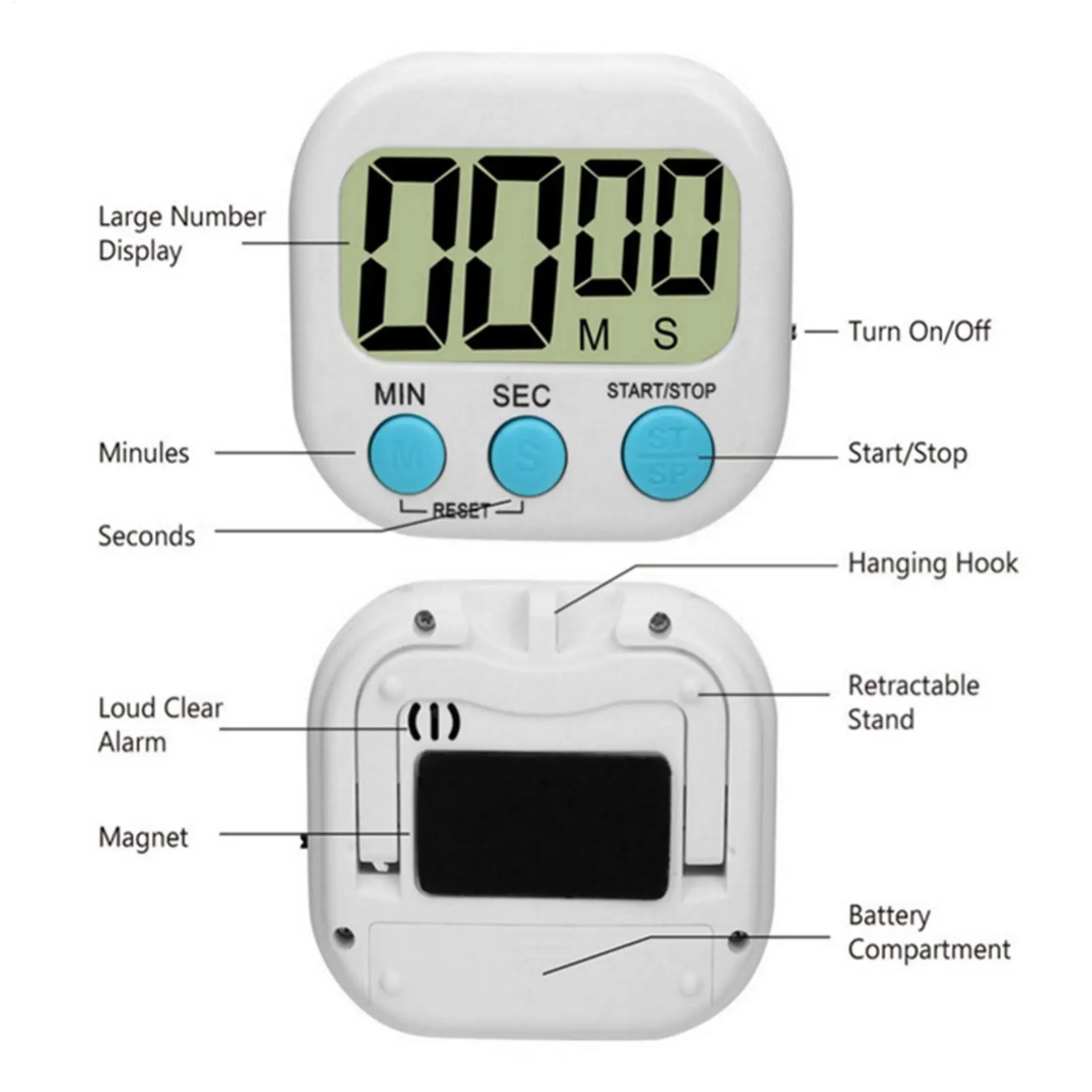 นาฬิกาจับเวลาในครัวแบบดิจิตอลได้รับการออกแบบให้มีปุ่มเปิด/ปิดขนาดใหญ่เพื่อการใช้งานที่ง่ายดาย จอแสดงผลดิจิตอลที่ชัดเจน และปุ่มที่ทำเครื่องหมายไว้อย่างชัดเจนเพื่อการใช้งานที่ง่ายดาย (ไม่มีแบตเตอรี่)Digital Timer ได้รับการออกแบบให้มีตัวเลขขนาดใหญ่และชัดเจน ซึ่งเหมาะสำหรับผู้ที่มีสายตาไม่ดีคุณสามารถอ่านการแสดงเวลาของนาฬิกาจับเวลาในครัวได้อย่างง่ายดาย เพียงแค่มองจากอีกมุมหนึ่งของห้อง