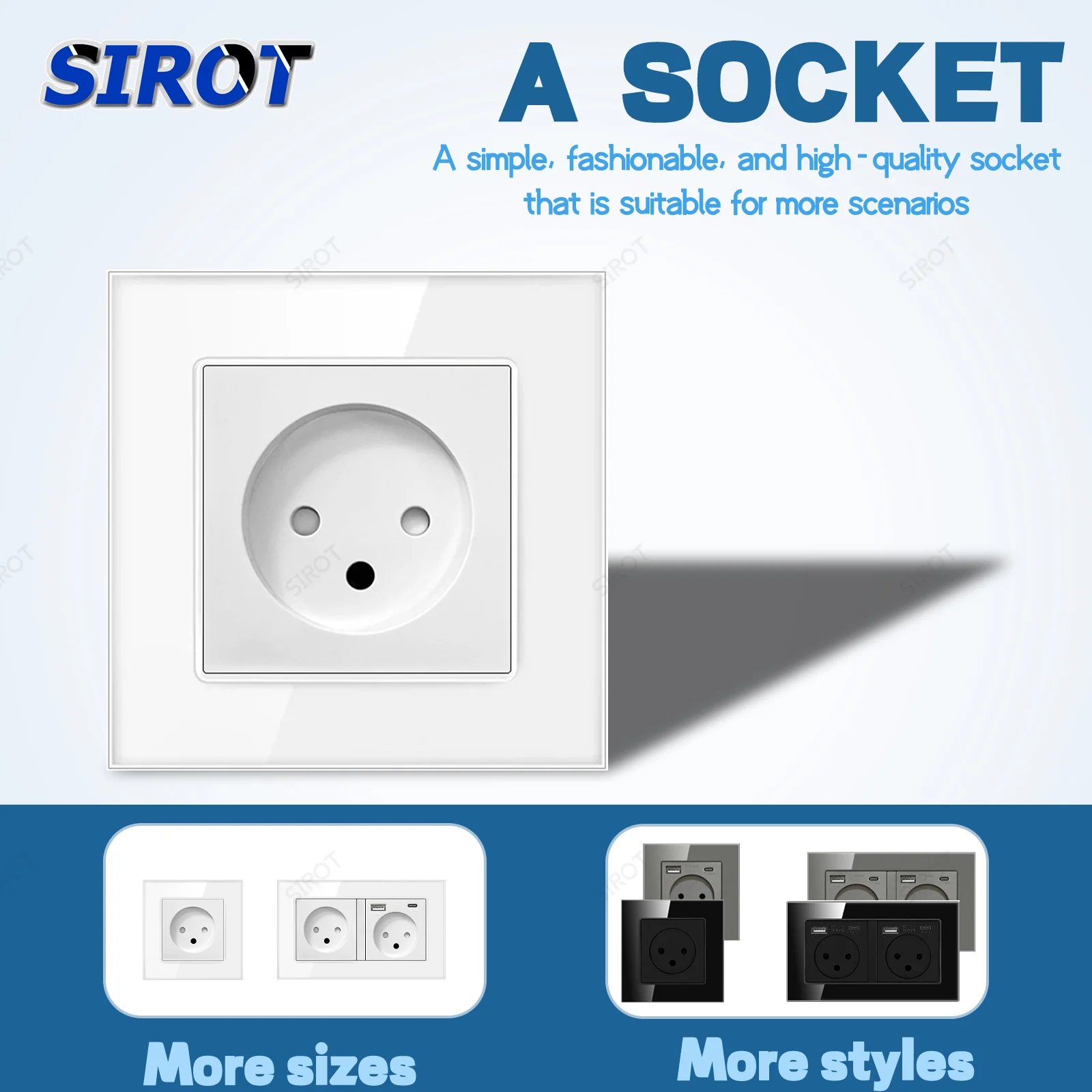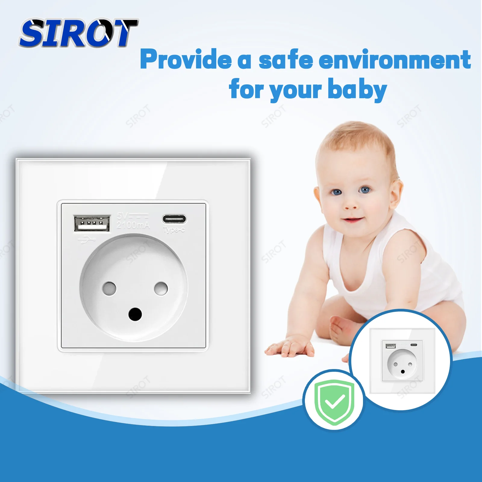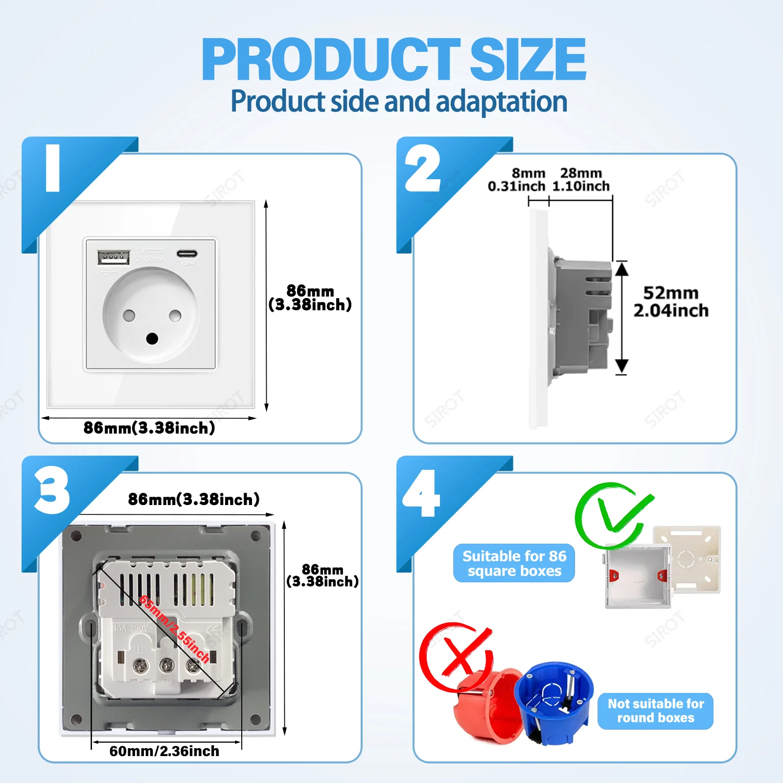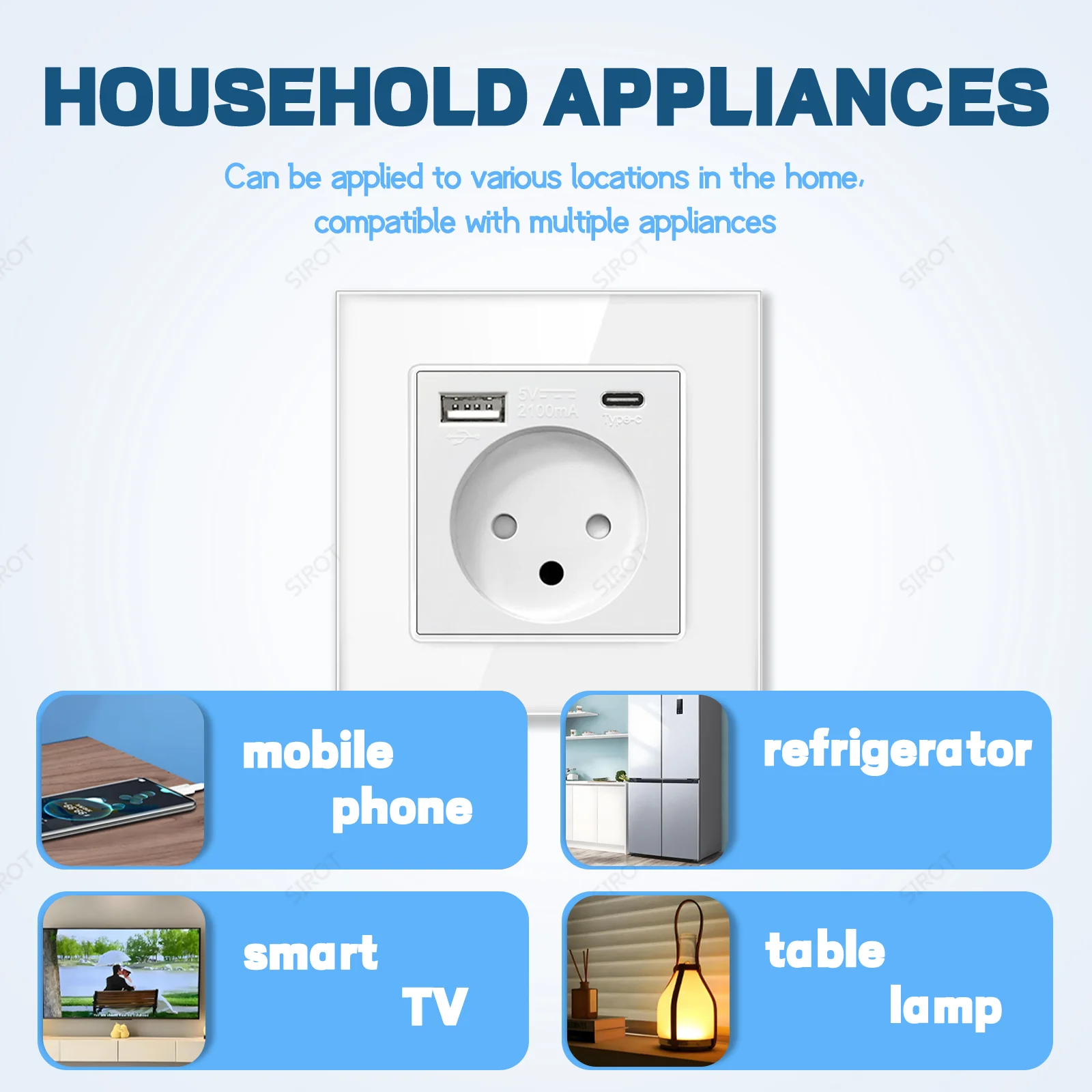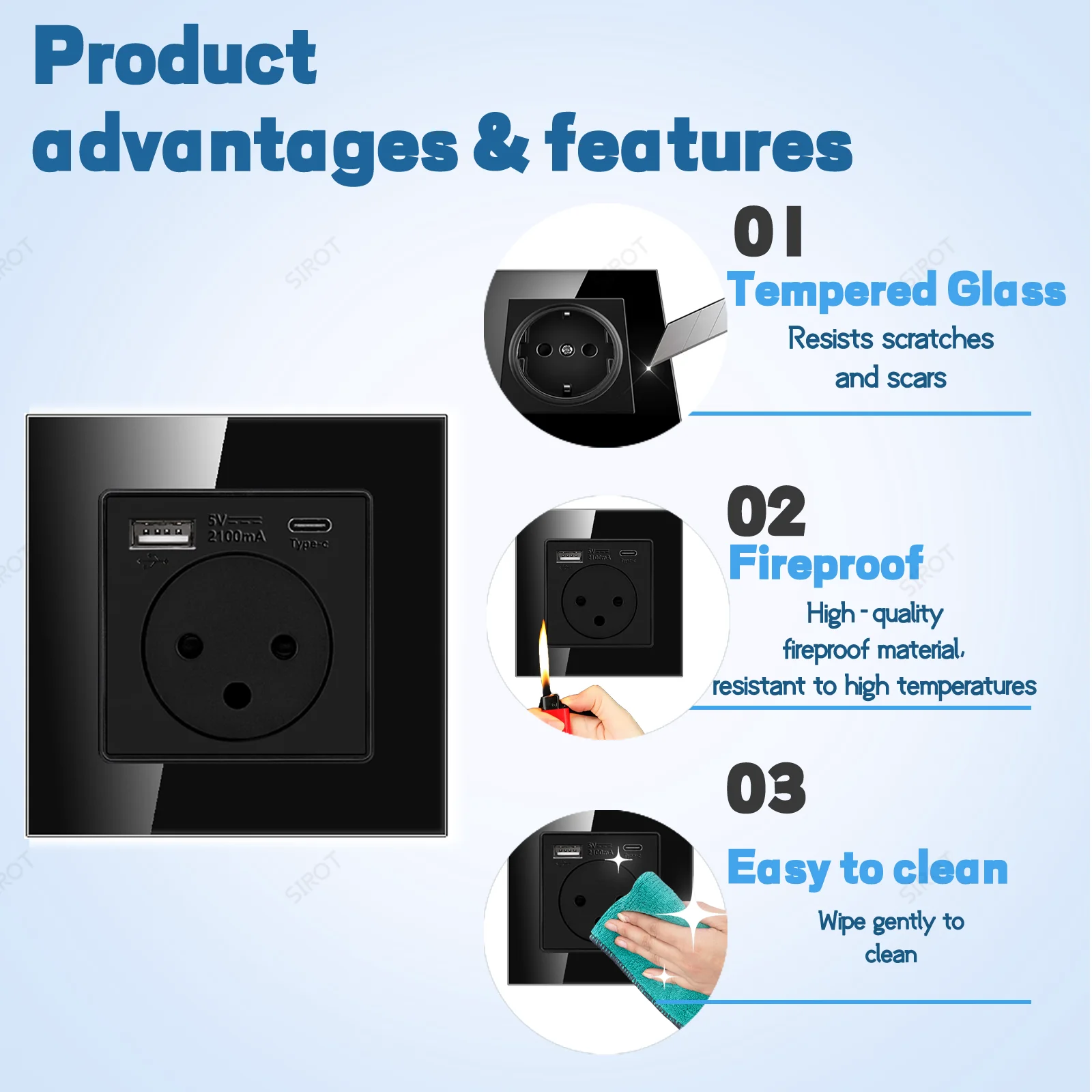 SIROT Israel Power Socket with USB Type C, 86mm Tempered Glass Panel, AC 230V 50Hz Israeli Standard Wall Outlet White Black Grey