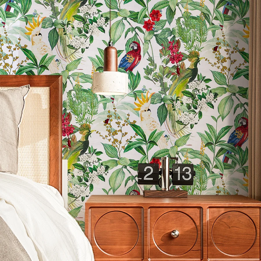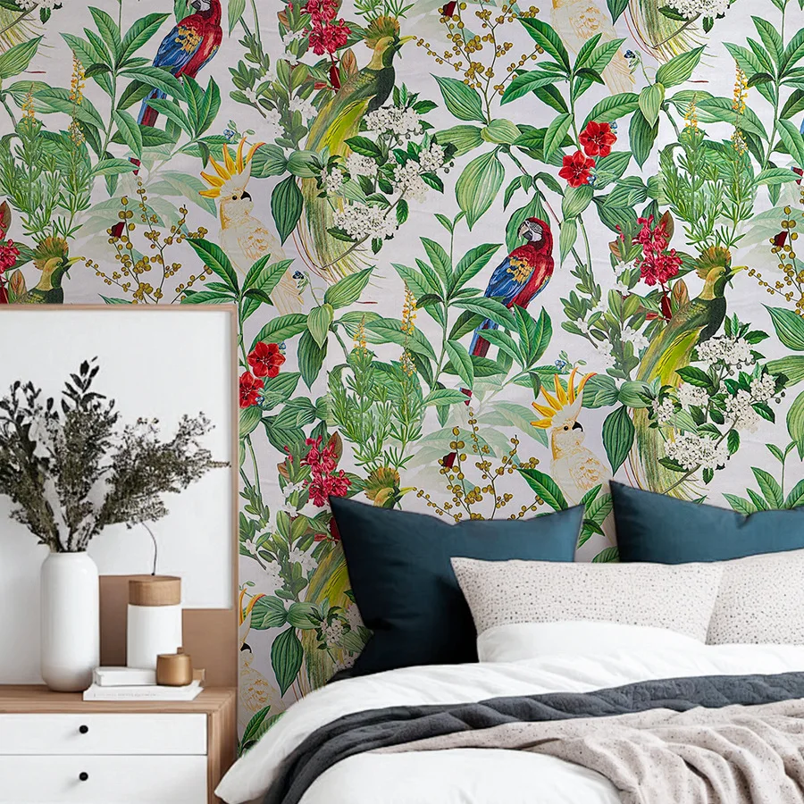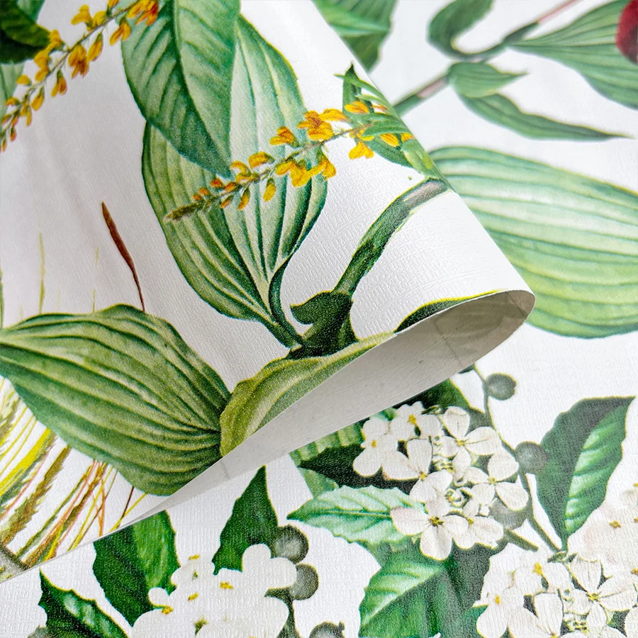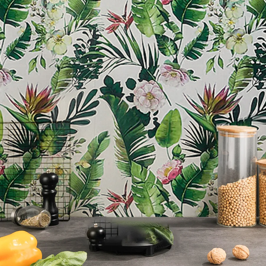 วอลเปเปอร์ลายต้นไม้เขียวชอุ่มจากป่าฝนเขตร้อน ดอกไม้ แบบมีกาวในตัว สำหรับตกแต่งบ้าน วัสดุก่อสร้าง สติ๊กเกอร์พื้นหลังสำหรับทีวี