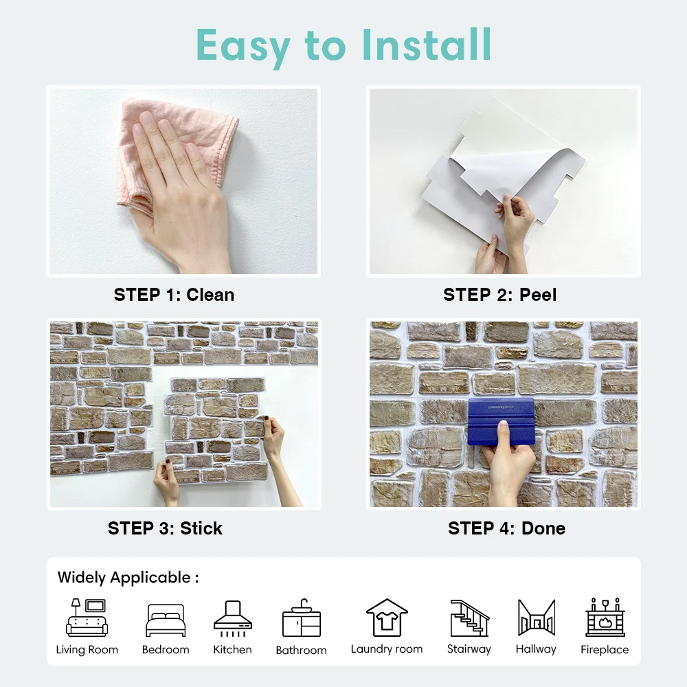 การติดตั้งที่ง่ายและรวดเร็ว: แค่ลอกแล้วติด!ไม่มียาแนว ไม่มีซีเมนต์ และไม่เลอะเทอะ!ตัดง่ายด้วยมีดอรรถประโยชน์หรือกรรไกรเหมาะสําหรับโครงการ DIY ตกแต่งผนัง