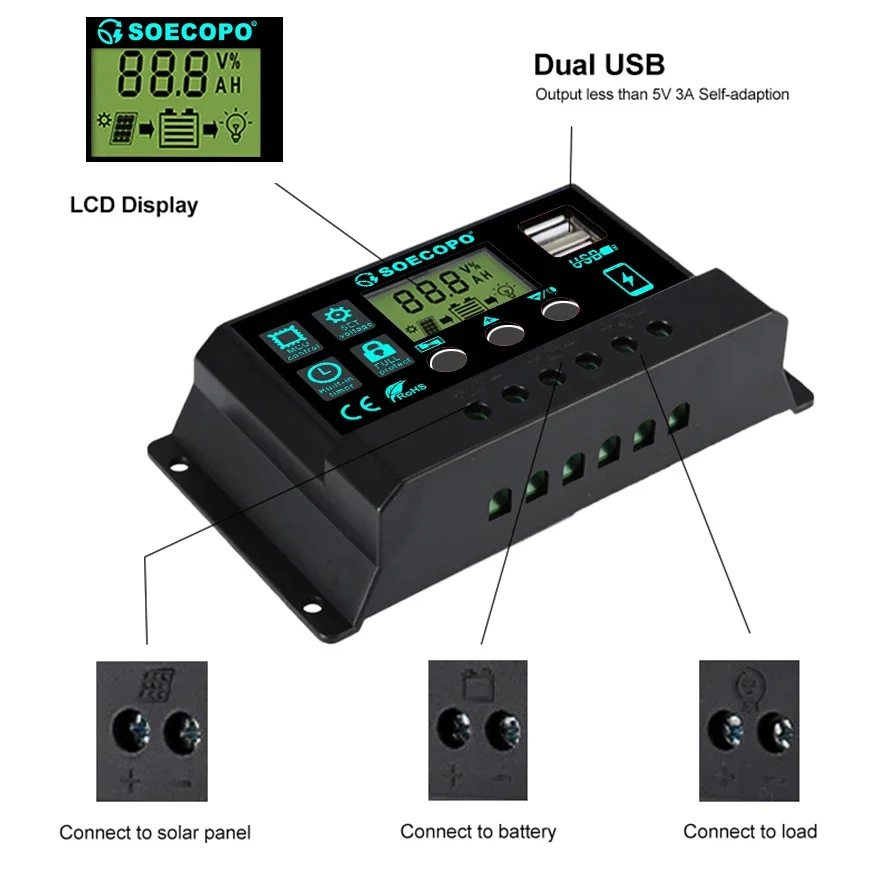 🔹 การชาร์จอุปกรณ์: สามารถใช้ชาร์จอุปกรณ์อิเล็กทรอนิกส์ เช่น โทรศัพท์มือถือและพาวเวอร์แบงค์ ผ่านพอร์ต USB คู่ของคอนโทรลเลอร์หรือพอร์ต USB คู่บนแผงโซลาร์เซลล์