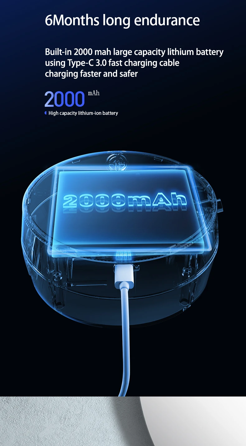【สแตนด์บายนาน】แบตเตอรี่ลิเธียมความจุขนาดใหญ่ 2000mAh ในตัวโดยใช้สายชาร์จด่วน Type-Cชาร์จเต็มสามารถใช้งานได้ 4 เดือน (เวลาสแตนด์บายอาจแตกต่างกันไปในสภาพแวดล้อมและการใช้งานที่แตกต่างกัน)