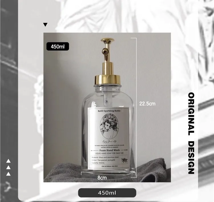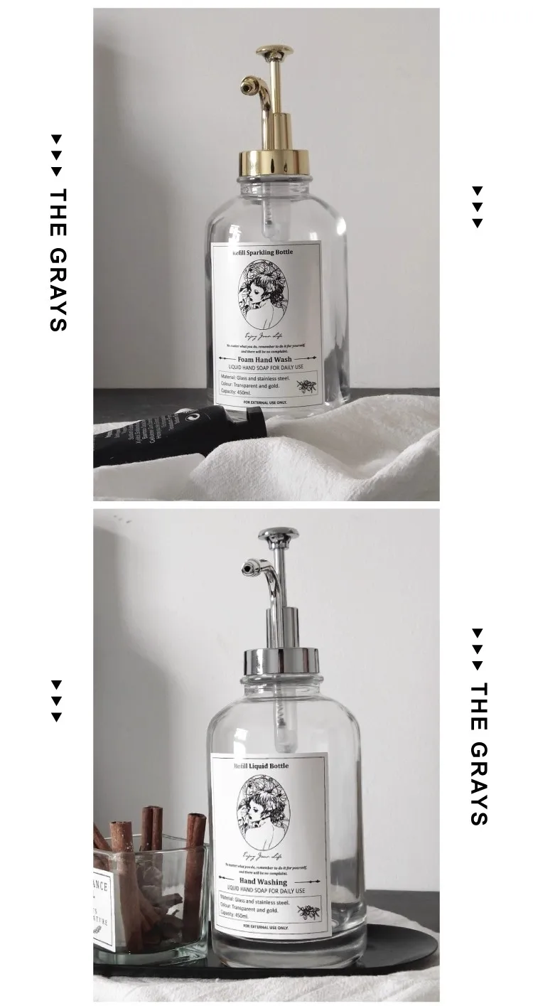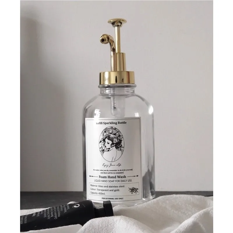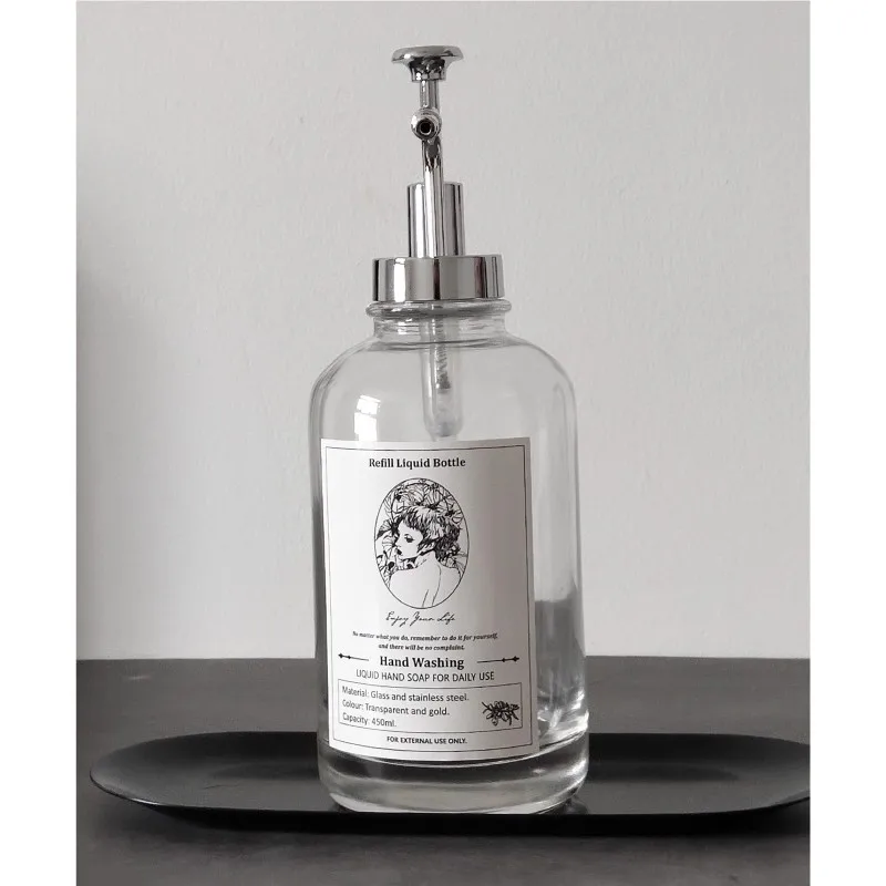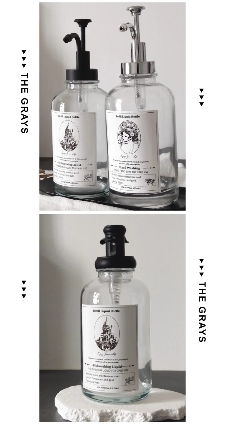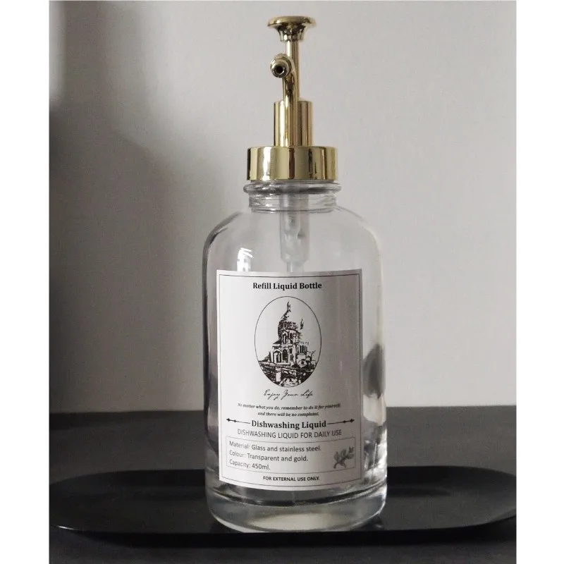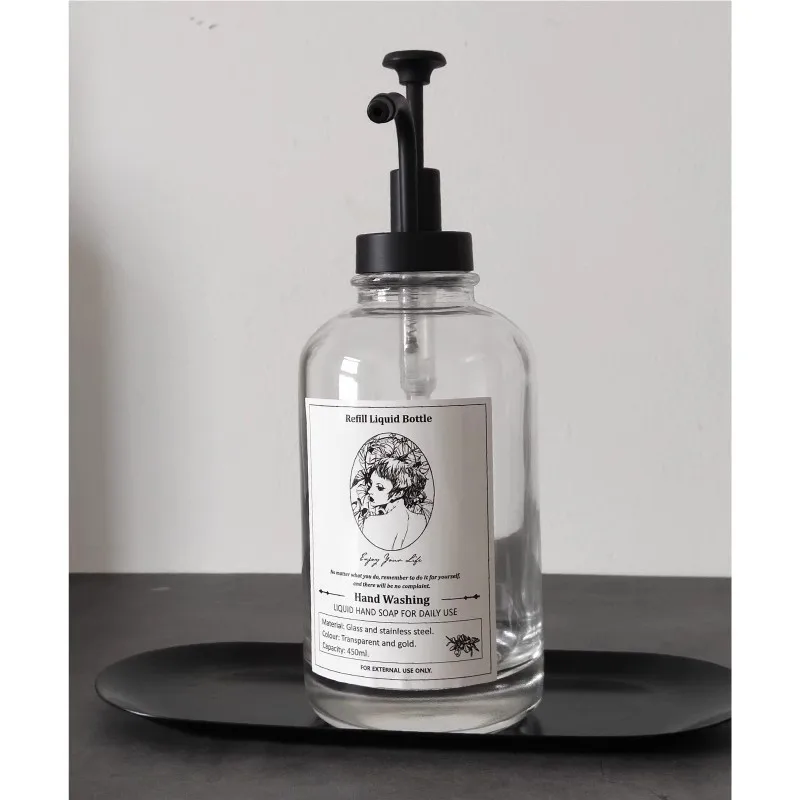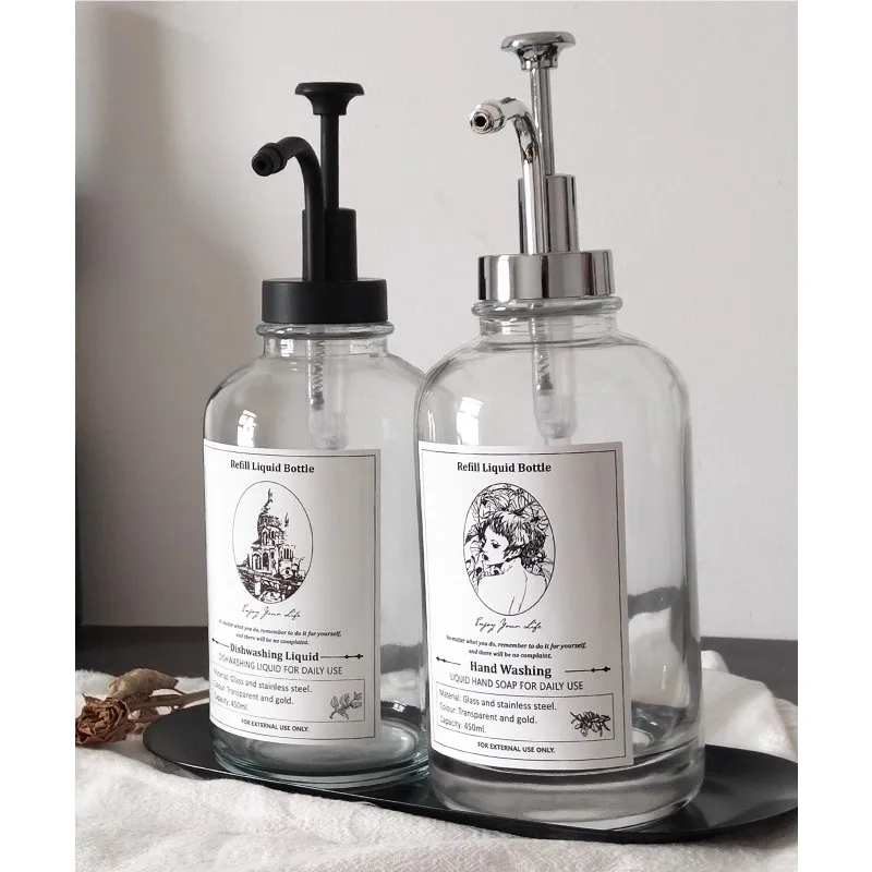 ชุดเครื่องจ่ายสบู่พร้อมป้ายฉลาก กรวย 450 มล. ขวดแก้วแบบใช้ซ้ำได้ ขวดใสสำหรับใส่กาแฟ น้ำเชื่อม ขวดใส