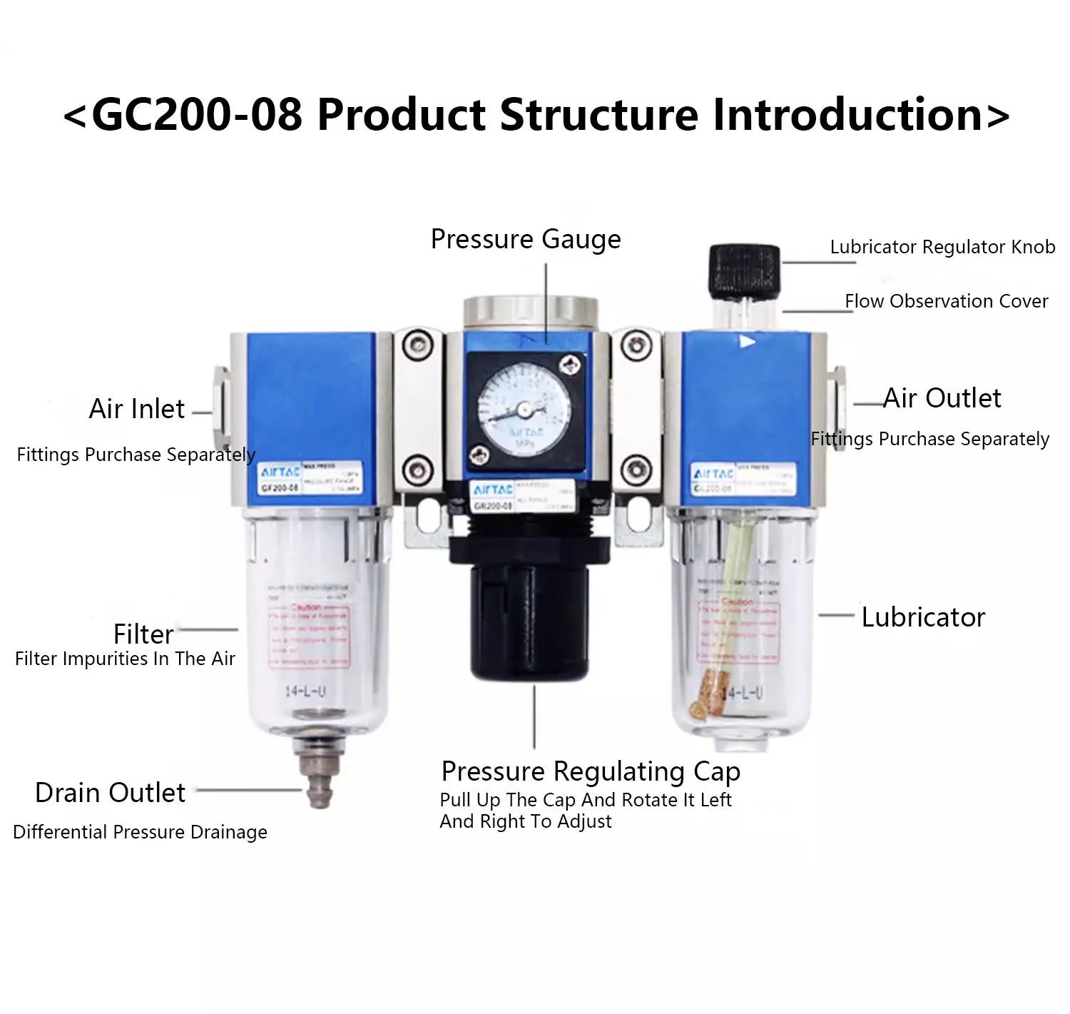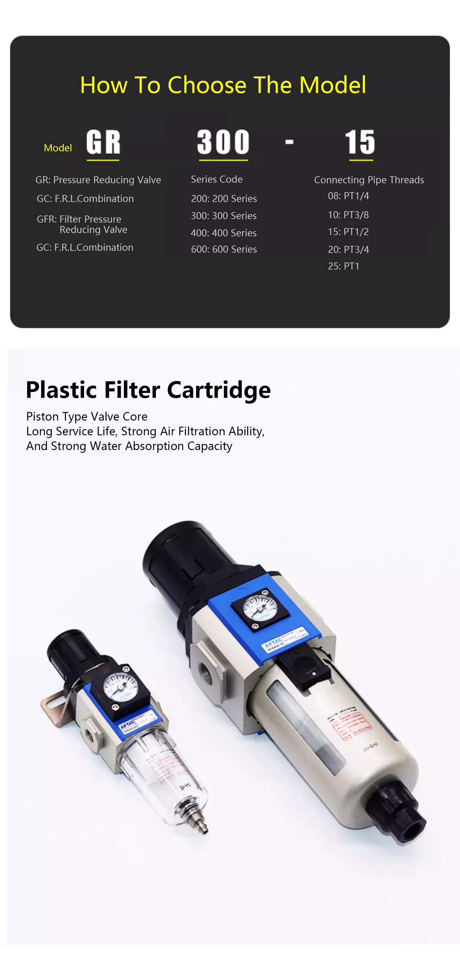 วาล์วปรับแรงดันพร้อมตัวกรองแยกน้ำมันและน้ำ Airtac GR/GFR/GC/GFC/GF/GL-200/300/400/600