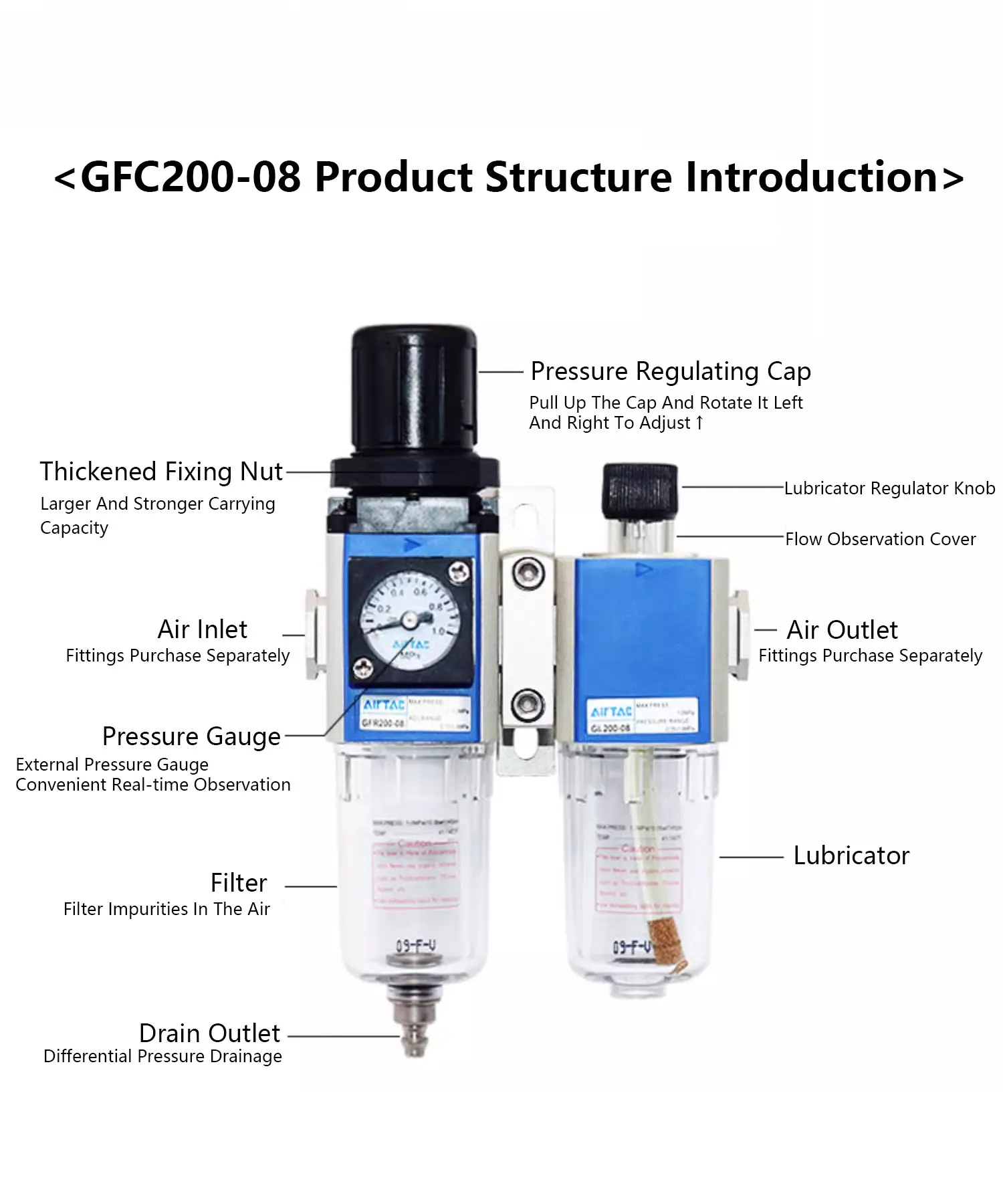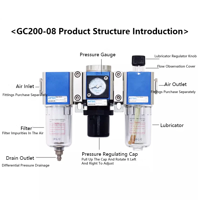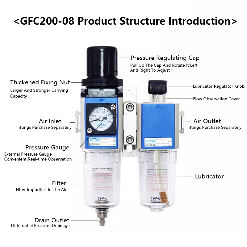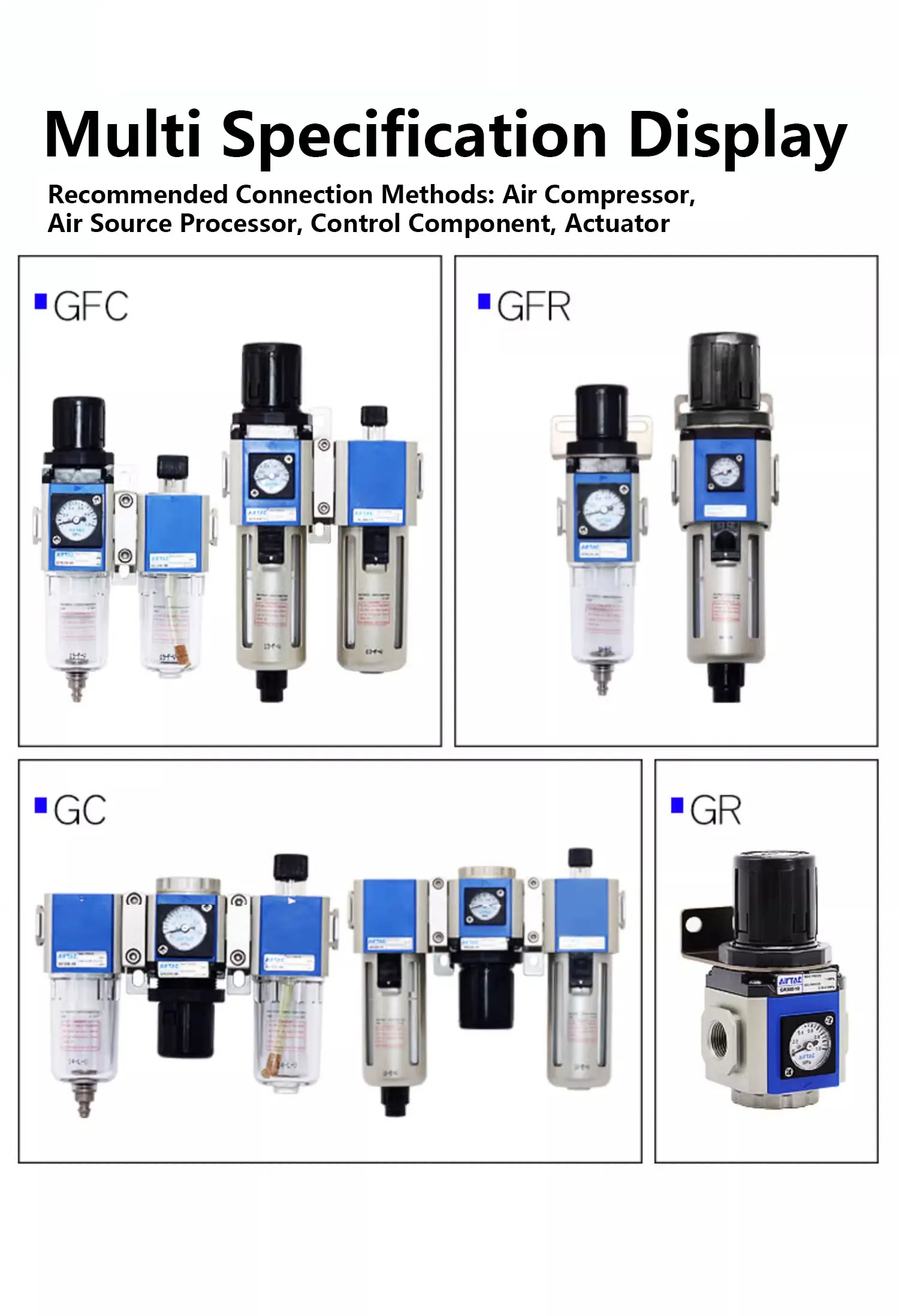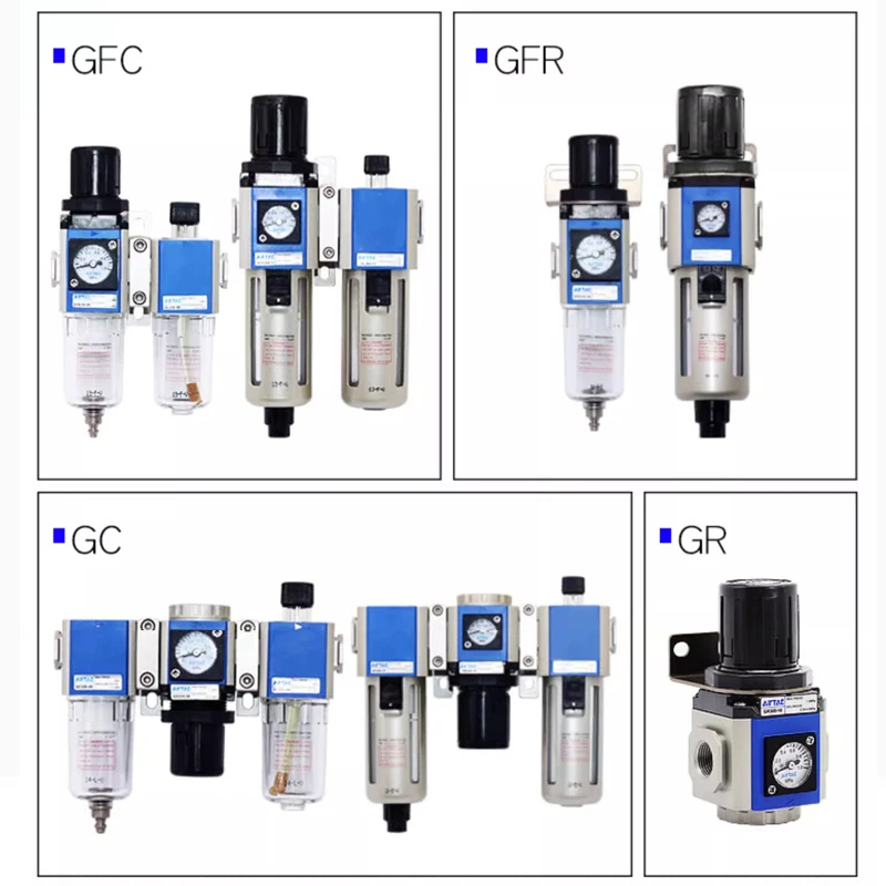 วาล์วปรับแรงดันพร้อมตัวกรองแยกน้ำมันและน้ำ Airtac GR/GFR/GC/GFC/GF/GL-200/300/400/600