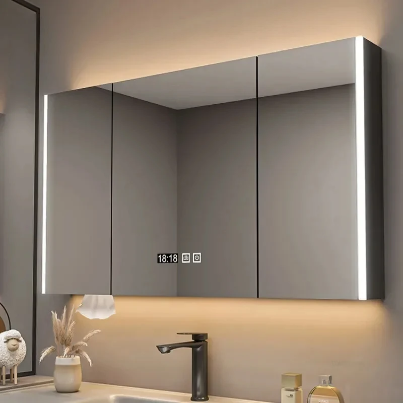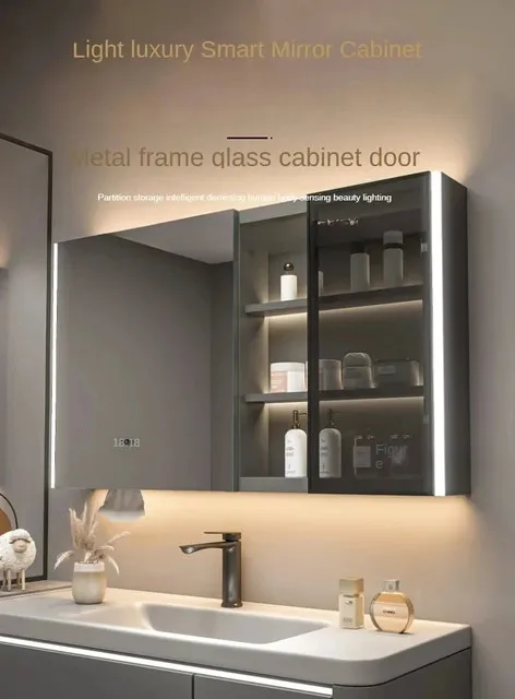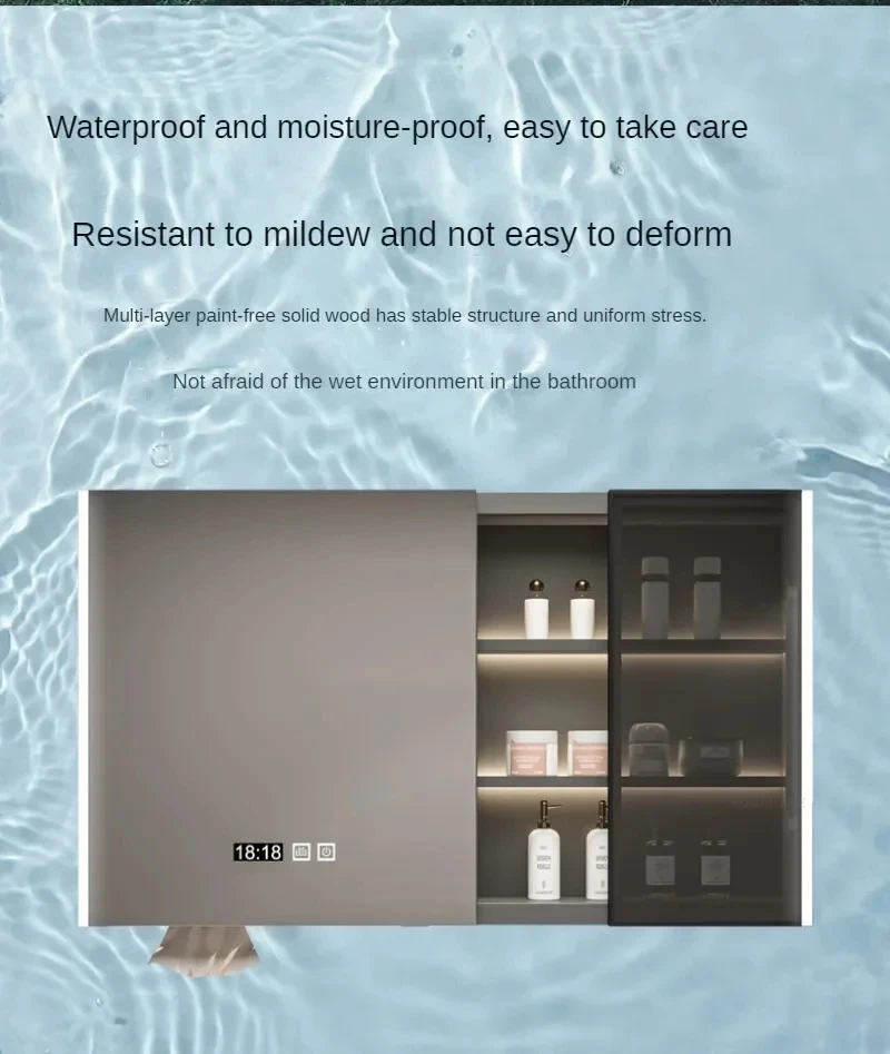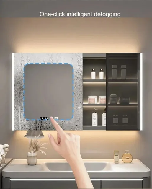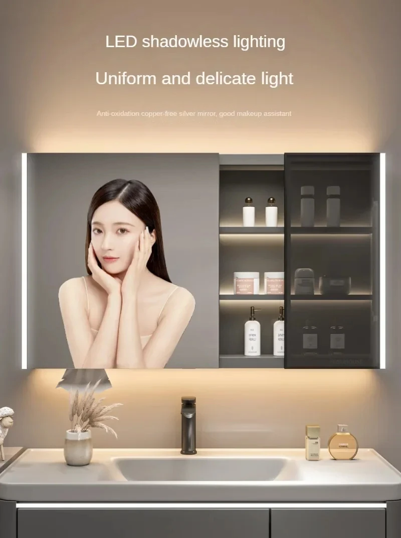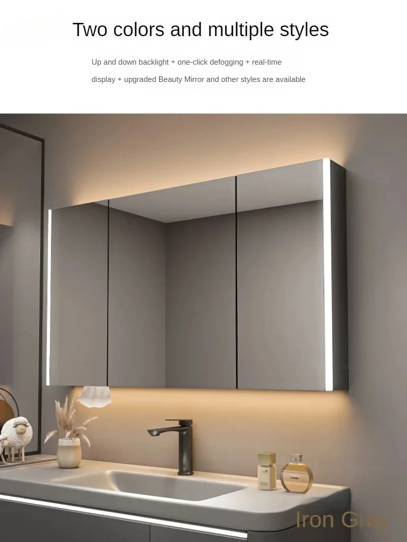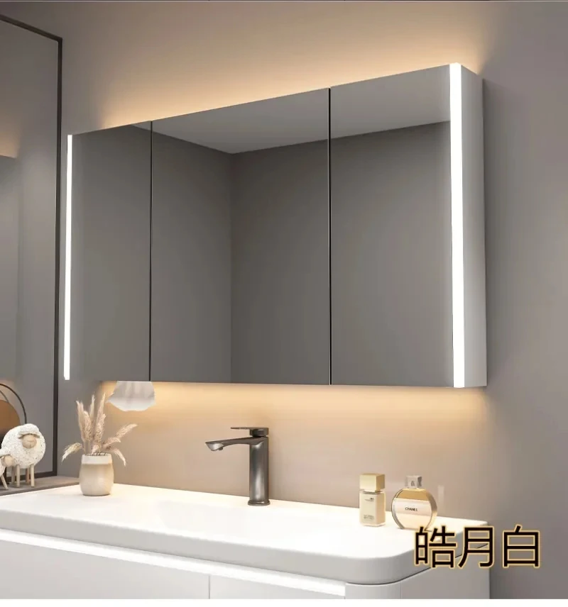 ตู้กระจกห้องน้ำอัจฉริยะพร้อมไฟ กระจกนอร์ดิกป้องกันหมอก เฟอร์นิเจอร์ห้องน้ำไม้เนื้อแข็ง กระจกพร้อมตู้เก็บของ M