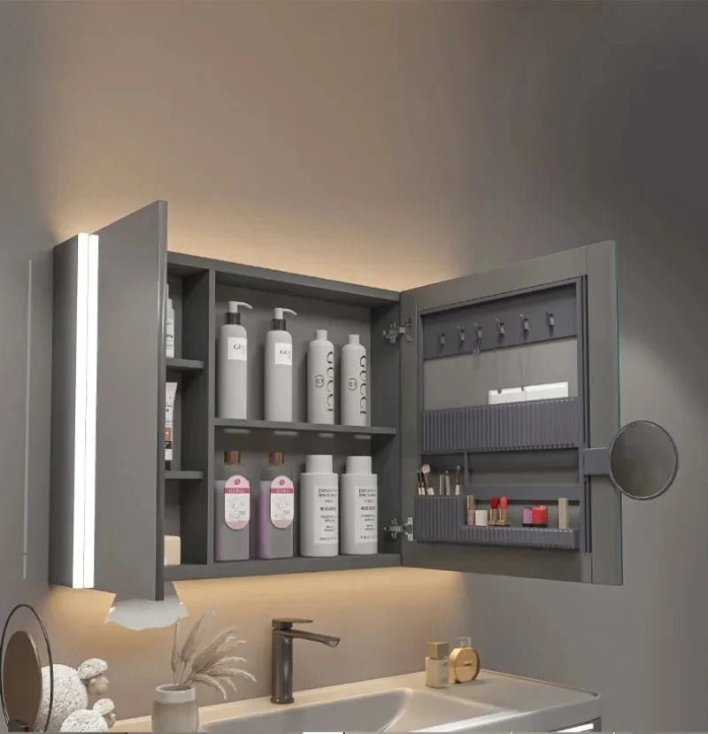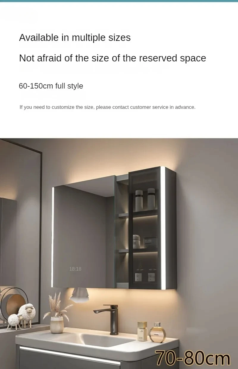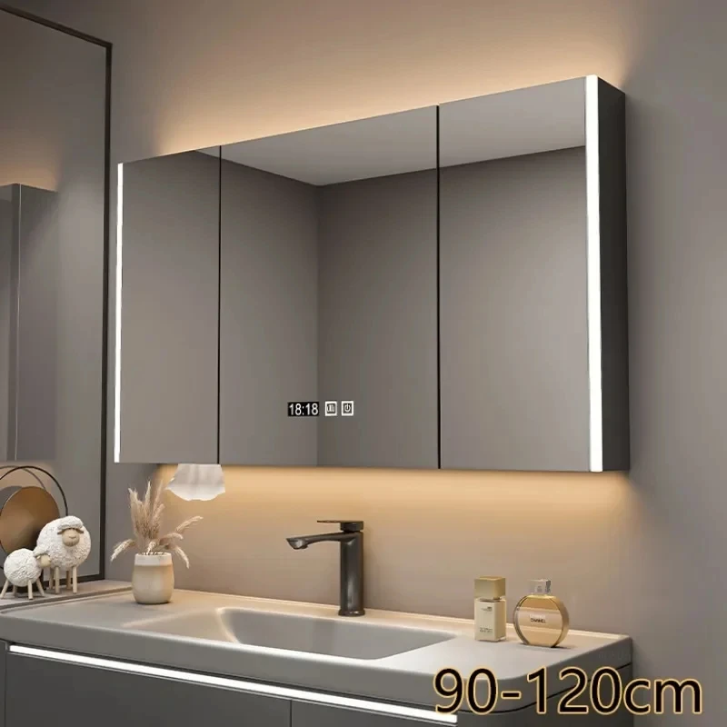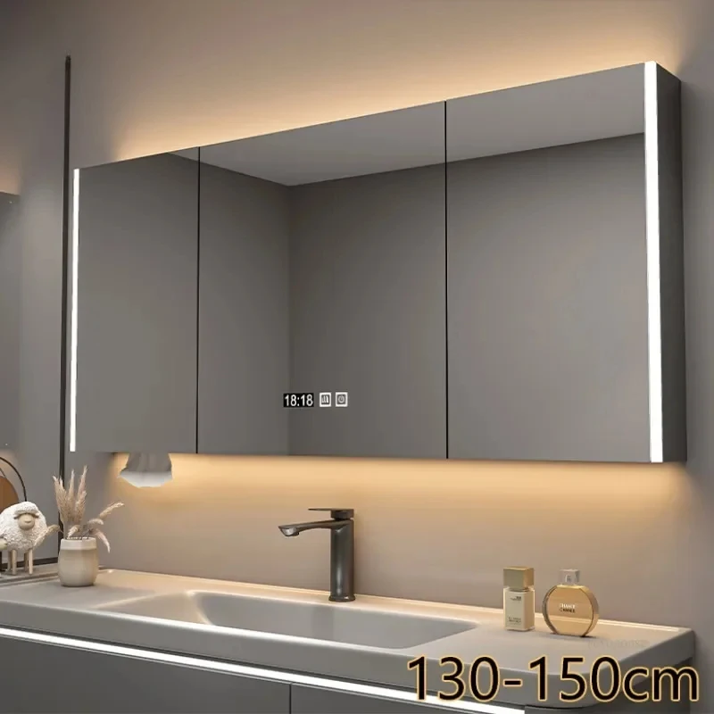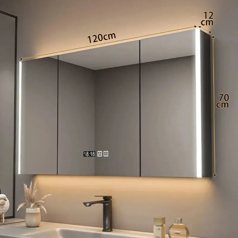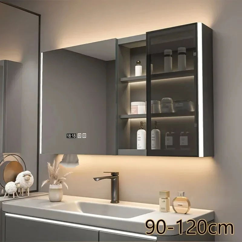 ตู้กระจกห้องน้ำอัจฉริยะพร้อมไฟ กระจกนอร์ดิกป้องกันหมอก เฟอร์นิเจอร์ห้องน้ำไม้เนื้อแข็ง กระจกพร้อมตู้เก็บของ M