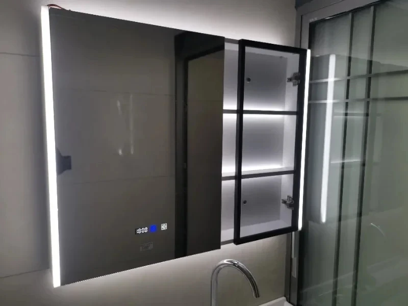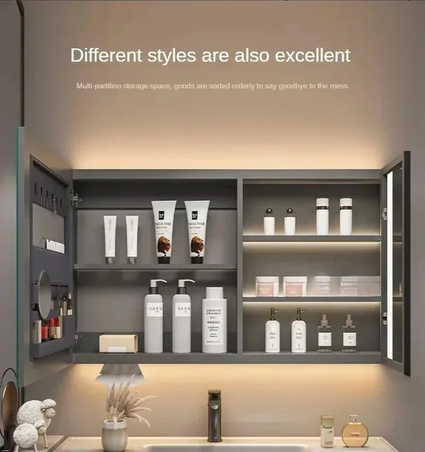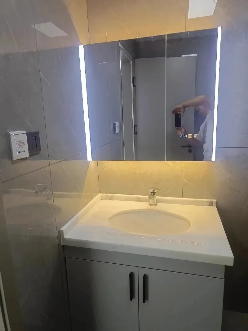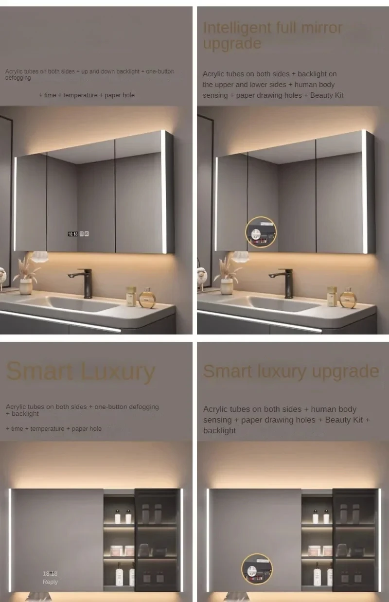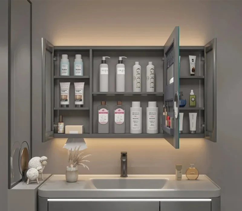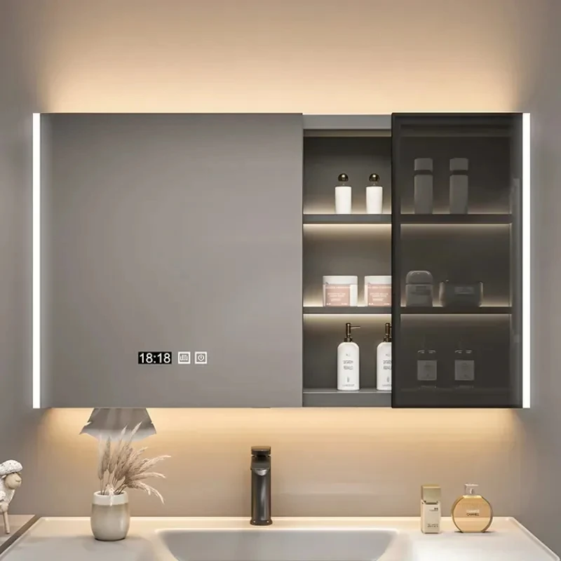 ตู้กระจกห้องน้ำอัจฉริยะพร้อมไฟ กระจกนอร์ดิกป้องกันหมอก เฟอร์นิเจอร์ห้องน้ำไม้เนื้อแข็ง กระจกพร้อมตู้เก็บของ M
